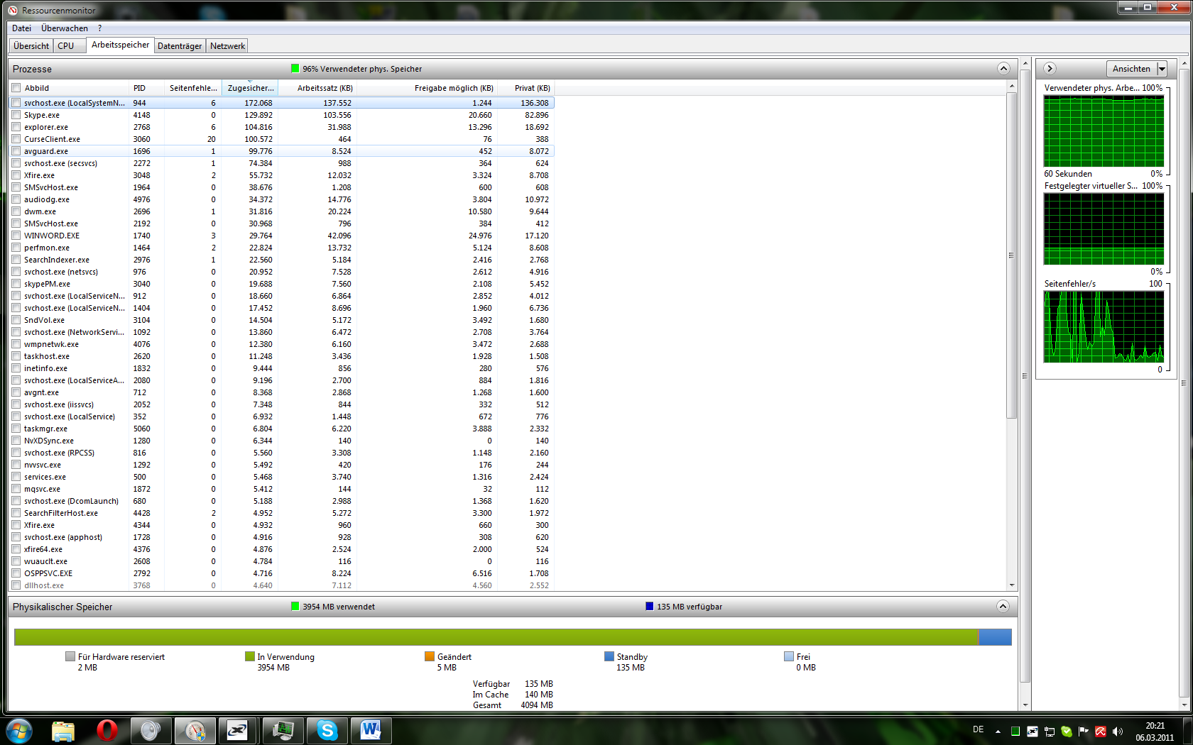 Ein Freund von mir hat ein sehr eigenartiges Problem. Seit neuem ist sein Rechner immer wieder total langsam, da der Arbeitsspeicher voll ist. Laut Taskmanager und Ressourcenmonitor gibt es zwar zum Beispiel die svchost.exe die unverhältnismäßig viel Ram braucht, addiert kommen ich so überm Daumen geschätzt nicht auf über 4GB!