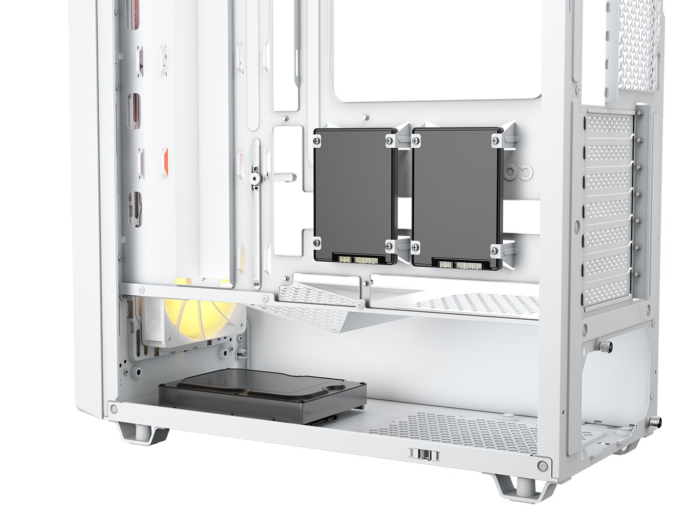 Im Gehäuseinnern präsentiert sich zunächst eine schlichte Hardware-Kammer, die zumindest einige Features bietet. Neben einem Grafikkartenarm werden Lüfteroptionen auf der Netzteilblende und Aussparungen für rückwärtige Mainboard-Anschlüsse geboten. Auf gummierte Kabeldurchlässe muss hingegen verzichtet werden.
