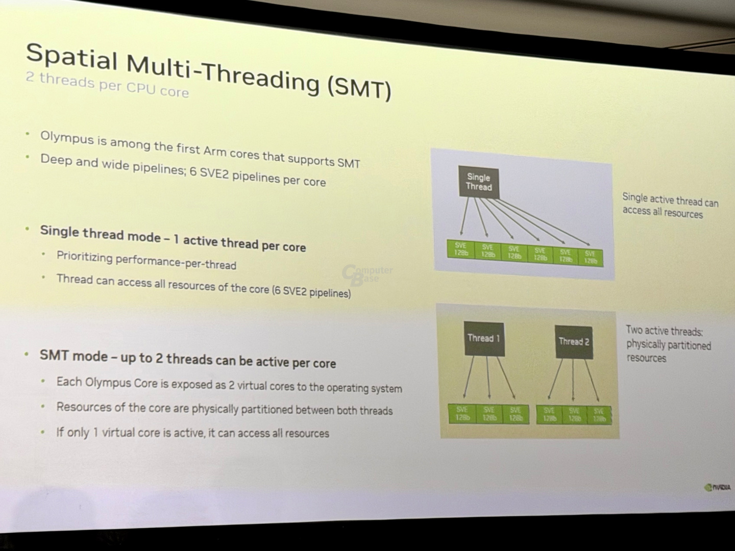 - Im SMT Mode können hingegen bis zu zwei Threads pro Core aktiv sein. Jeder Olympus-Kern wird gegenüber dem Betriebssystem als zwei virtuelle Kerne exponiert. Die Ressourcen des Cores werden in dieser Konfiguration physisch partitioniert und stehen beiden Threads in gleicher Anzahl zur Verfügung, also etwa drei SVE2-Pipelines pro Thread. Ist im SMT Mode allerdings nur ein Thread aktiv, kann dieser wieder auf alle Ressourcen zugreifen.