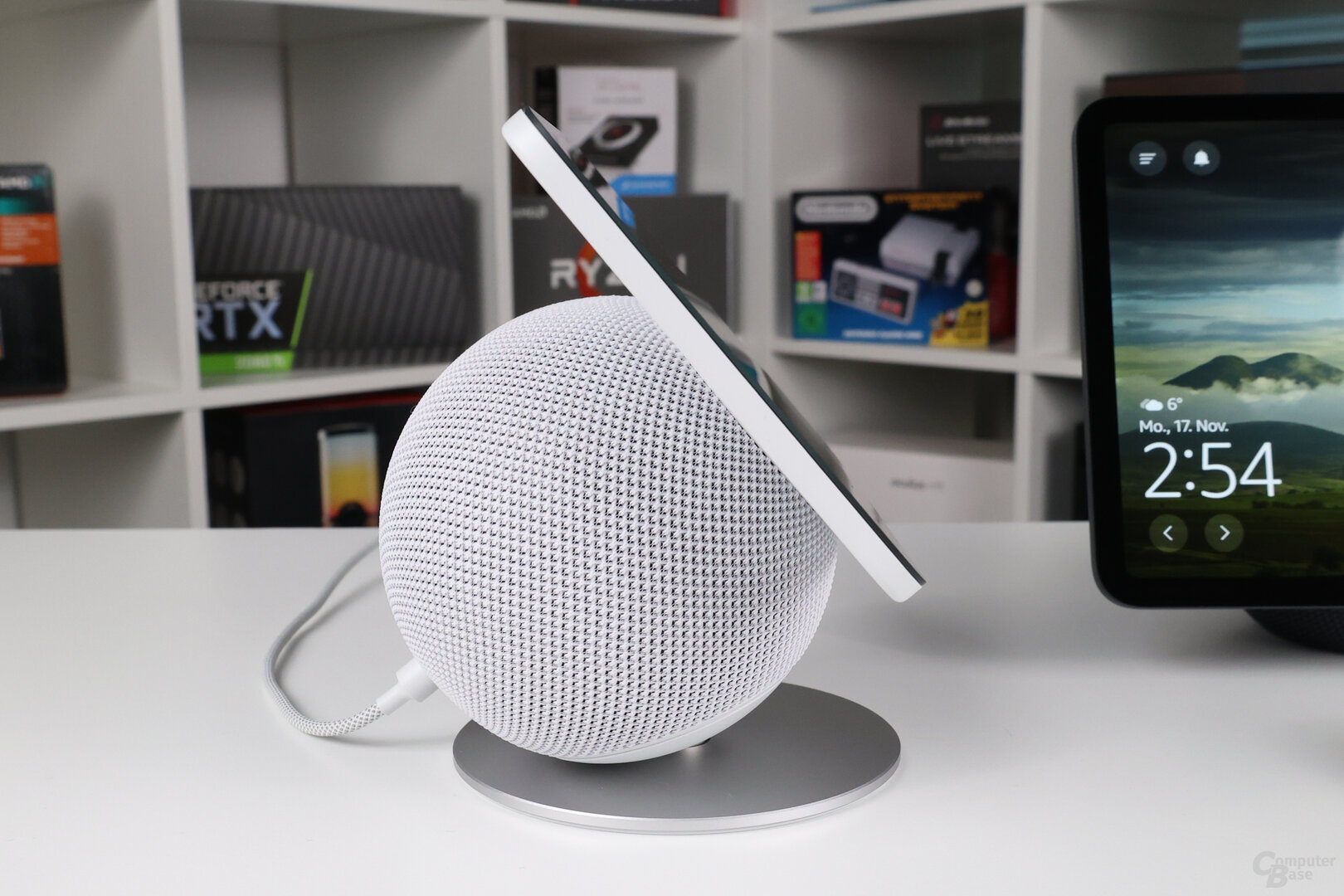 Damit man das Display besser ausrichten kann, empfiehlt sich im Alltag daher der Kauf des optionalen Ständers, der eingangs bereits erwähnt wurde. Er lässt sich einfach in der passenden Farbe unten über Magneten an die neuen Echo Show andocken und bietet dann eine 40°-Neigungs- und 360°-Schwenkfunktion. Das ist im Alltag sehr praktisch und verleiht dem Design zudem noch etwas mehr Leichtigkeit, auch weil es die Displays etwas weiter von der Oberfläche hebt.