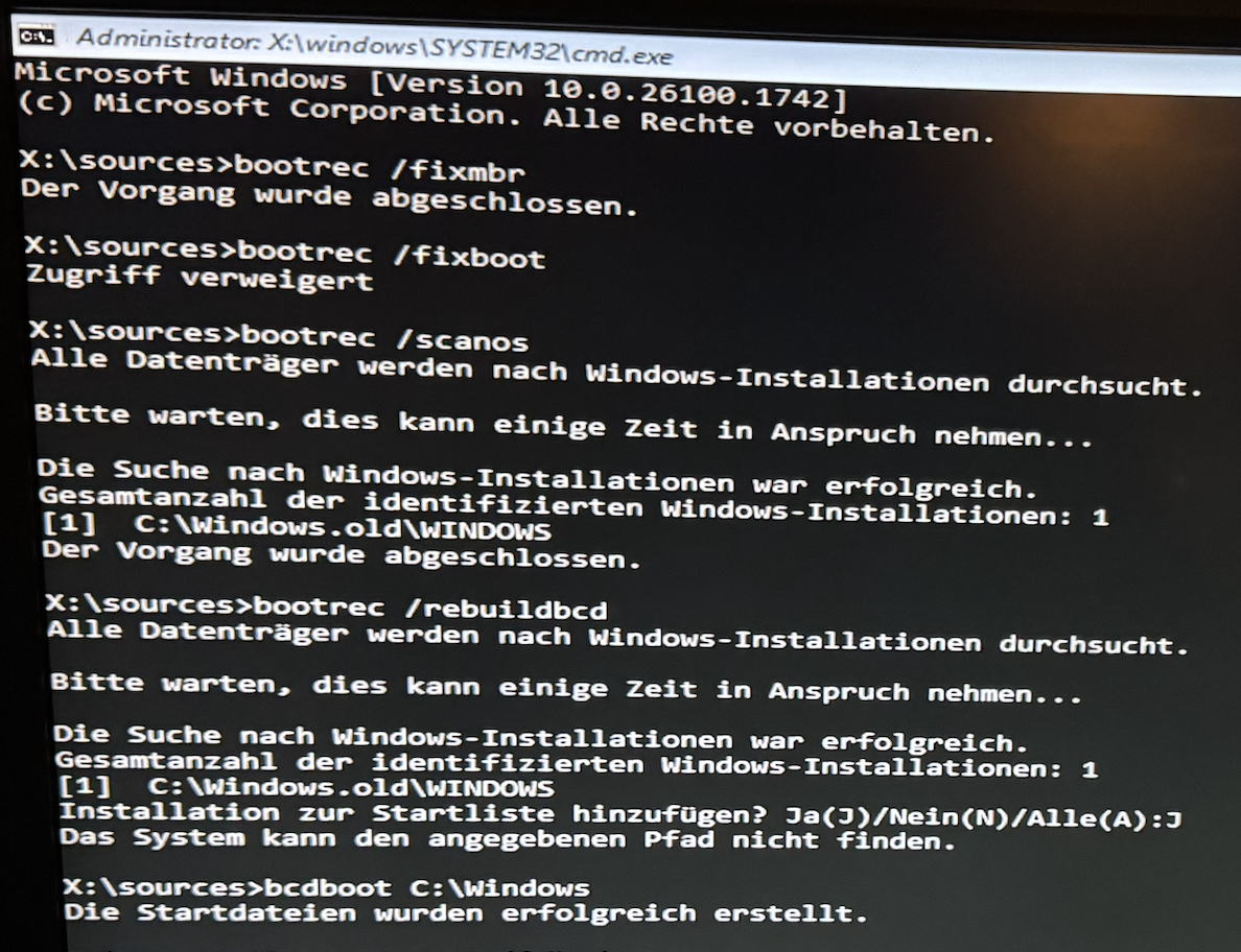 - Von Win 11 CD gestartet und über die Eingabeaufforderung folgende Befehle abgesetzt;
