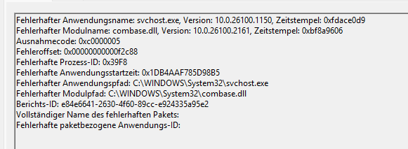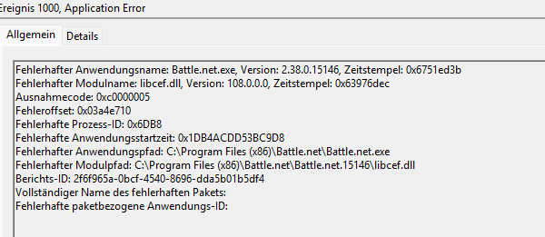 - In der Ereignisanzeige wird der Fehlercode 0xc0000005 angezeigt.