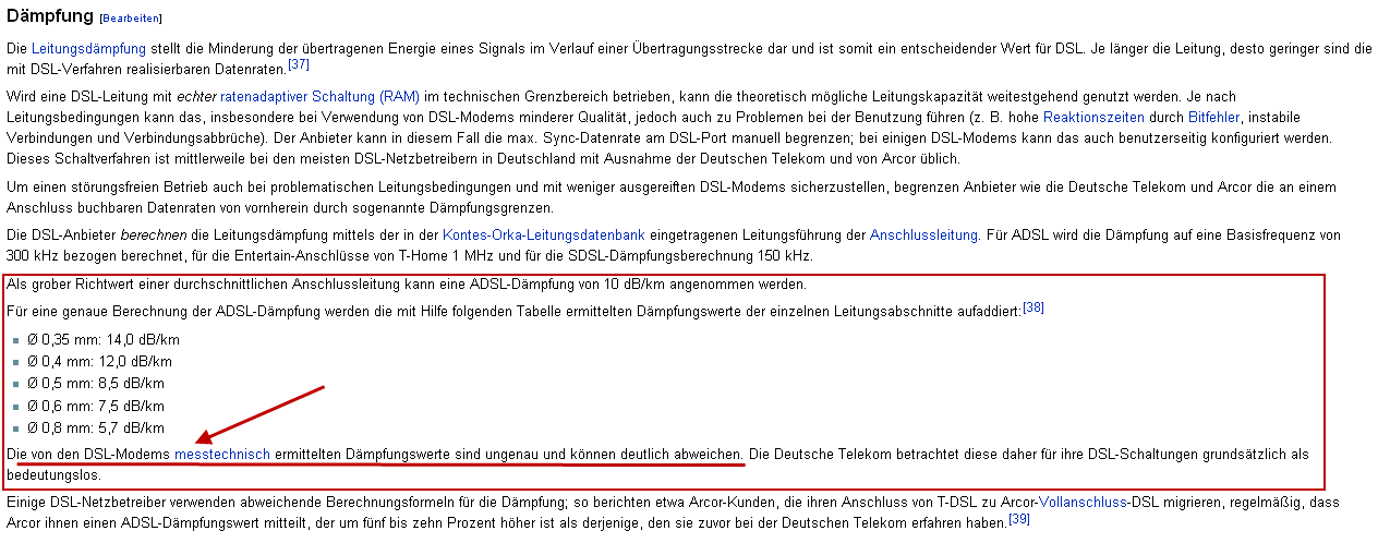 Daß es derzeit nur ein Meßgerät gibt, das bei ADSL2+ und schnelleren Anschlüssen die korrekte Dämpfung ermittelt, steht auf einem anderen Blatt, denn die alte, in der unglaubwürdigen Wiki genannte Dämpfung von 18dB stimmt schon lange nicht mehr, da sie die falsche Grundfrequenz von 300KHz als Grundlage nimmt. Da ADSL2+ und VDSL andere (mehr) Frequenzbänder nutzen, mußte auch die Grundfrequenz, bei der eine bestimmte Dämpfung nicht überschritten werden darf, auf 1MHz (bei ADSL2+, bei VDSL liegen die Frequenzen noch deutlich höher) angepaßt werden.