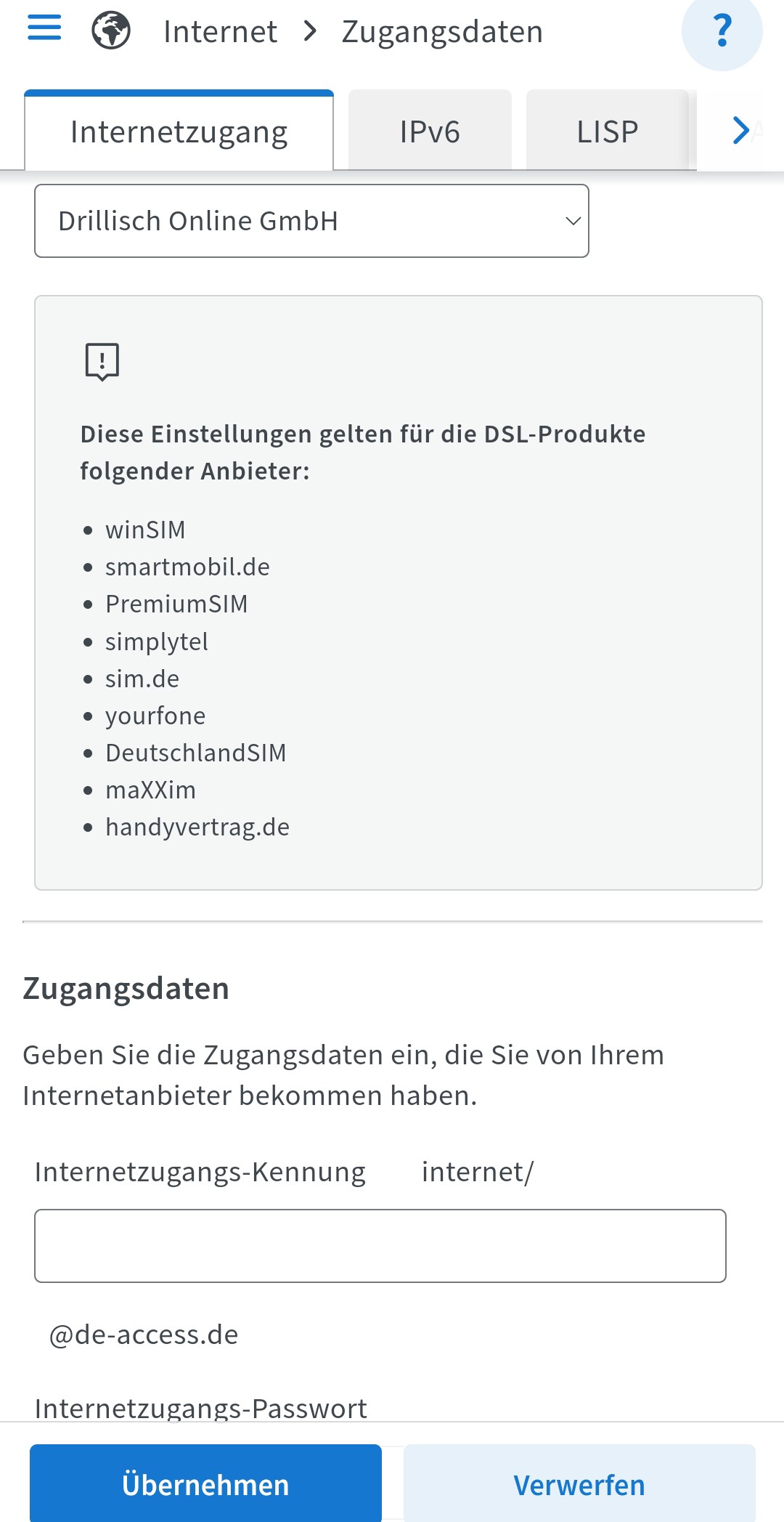 Jedenfalls sagt die Fritzbox mir aber, dass die Benutzerdaten falsch seien. Ich habe im Kundenlogin eine neues DSL-Passwort generiert usw. Die Anleitung https://imagepool.drillisch-online.de/global/service/pdf/Anleitung_Internetzugangsdaten_FritzBox.pdf scheint veraltet, das sieht bei mir anders aus, Screenshot folgt. "Hinternet" gebe ich gar nicht mehr ein, oder? (Wirklich Hinter, wie Ar***?) Hat jemand Screenshots von einem laufenden Anschluss?