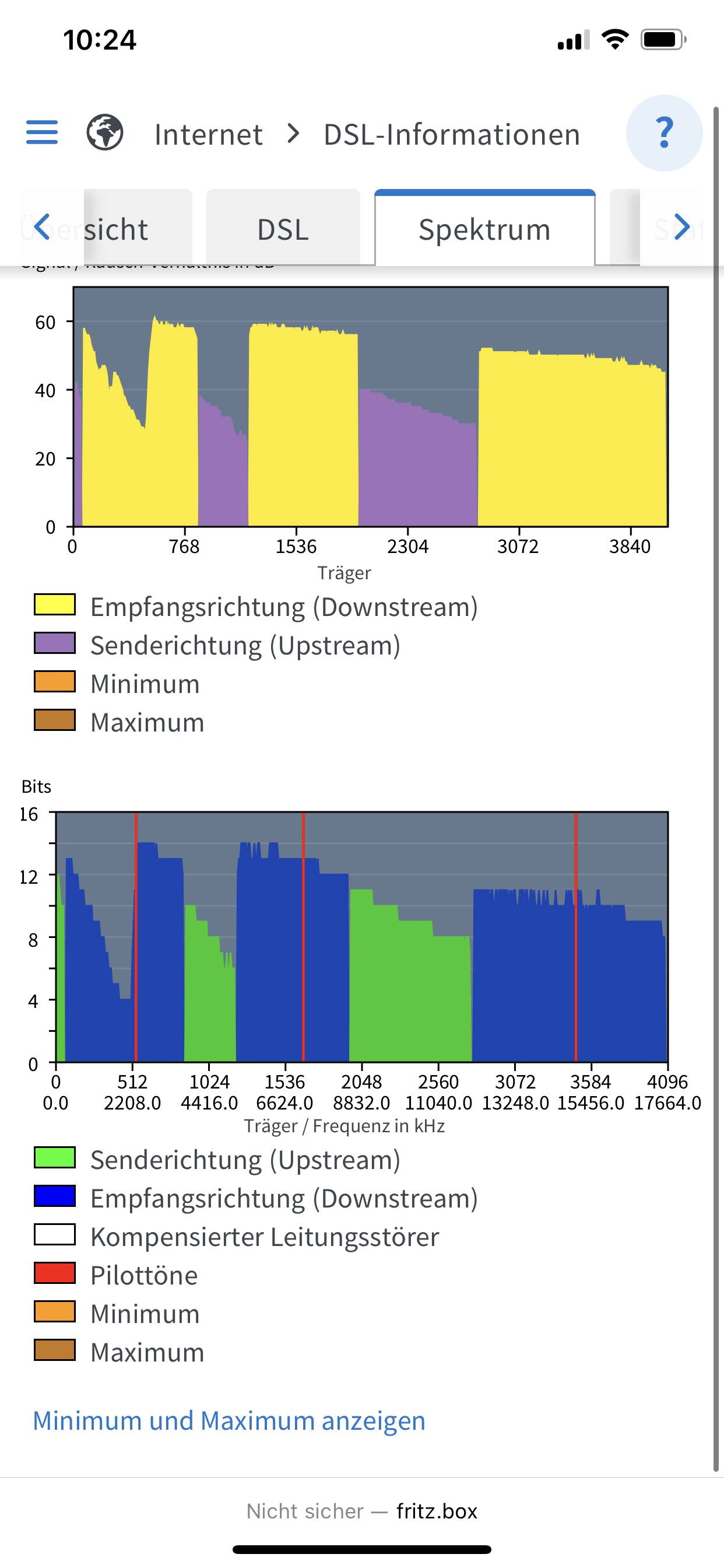 Gut wäre, wenn du in der FRITZ!Box beim Spektrum noch anklicken könntest, dass auch Minimum/Maximum angezeigt werden. Dann sind möglicherweise Schwankungen sichtbar, die helfen könnten, das Problem einzugrenzen.