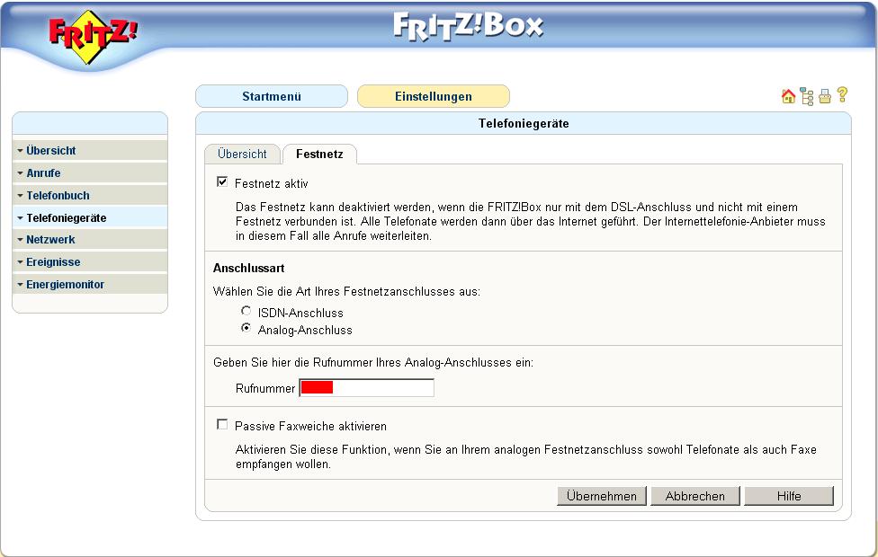 Bitte tragen Sie die entsprechende Rufnummer 'ohne Vorwahl' dort ein und bestätigen Sie Ihre Eingabe mit der Schaltfläche 'Übernehmen'.