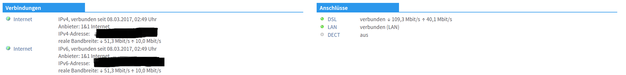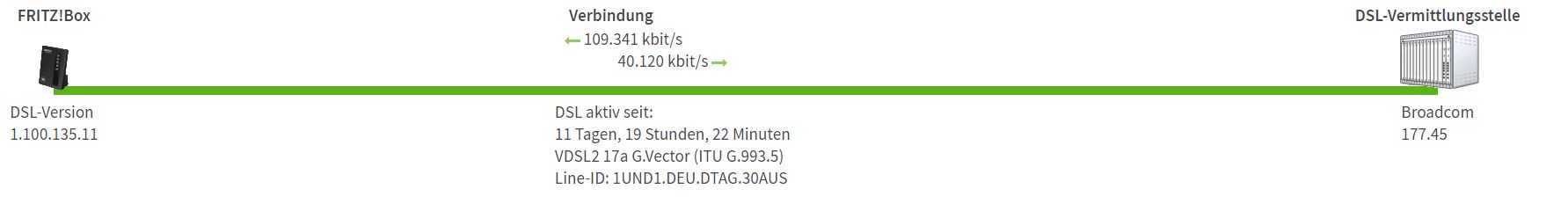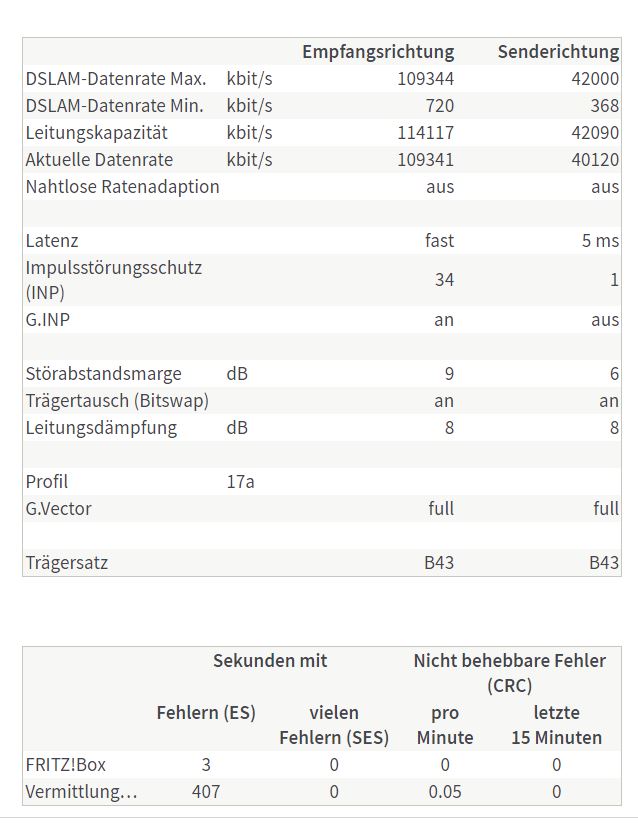 In der FritzBox steht bei der Leitungskapazität von ~109/40 Mbit/s. Screenshots kann ich dann heute Abend gerne zur Verfügung stellen.