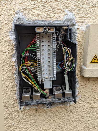 Bei der Verkabelung habe ich unten eine Verteilerdose des Kabels welches vom APL kommt. Sieht für mich nicht fachmännisch angeschlossen aus. (Haus wurde gekauft. Ich würde die Verteildose auch gerne rausnehmen, bin mir aber nicht sicher wie ich eine LAN oder TAE dose an dem kabel anschließen muss. Da kommen vier Litzen vom APL. Die Verteildose wird so eg nicht mehr benötigt.