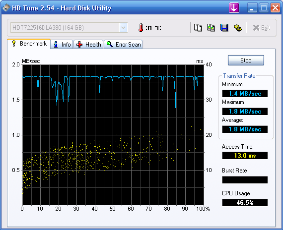 Laut HD Tune 2.54 habe ich eine durchschnittliche Transferrate von 1,8MB/s.