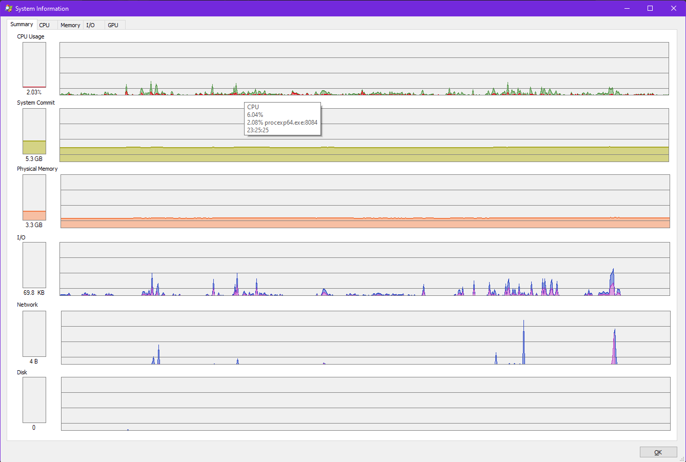 Der Proccess Explorer zeigt im Diagramm an welcher Prozess die Last verursacht.