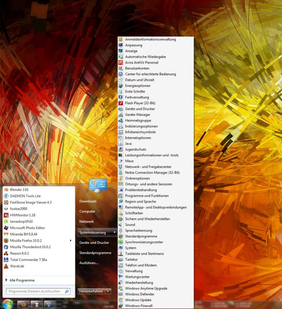 Das "alte" Startmenü aus Win7: ein Traum! Eine Hand am PC, eine Hand an der Kaffeetasse, schwupp schwupp, wenige Klicks und ich kann einhändig jede Funktion in Windows erreichen (Stichworte: Systemsteuerung als aufklappbares Menü im Startmenü). Außerdem hab ich hier mit genau einem Klick meine ~10 Programme in einer kleinen Liste von vielleicht 200px Höhe schön alphabetisch untereinander sortiert. Dadurch war meine Taskleiste immer komplett leer (nix angepinnt). So einfach, übersichtlich und schön kann es sein. Siehe Bild. Davon muss ich mich bei Win 8 nun verabschieden (wenn nicht ständig in die Metro steigen will).