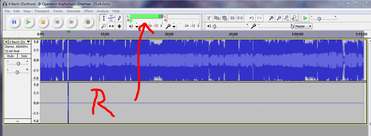 Hab ich Dir doch oben geschrieben und Du siehst es doch auf dem Abbild: der rechte Kanal ist ganz leise und enthält nur einen Grundsound, der eigentliche Audio-Stream liegt allein auf dem linken Kanal.