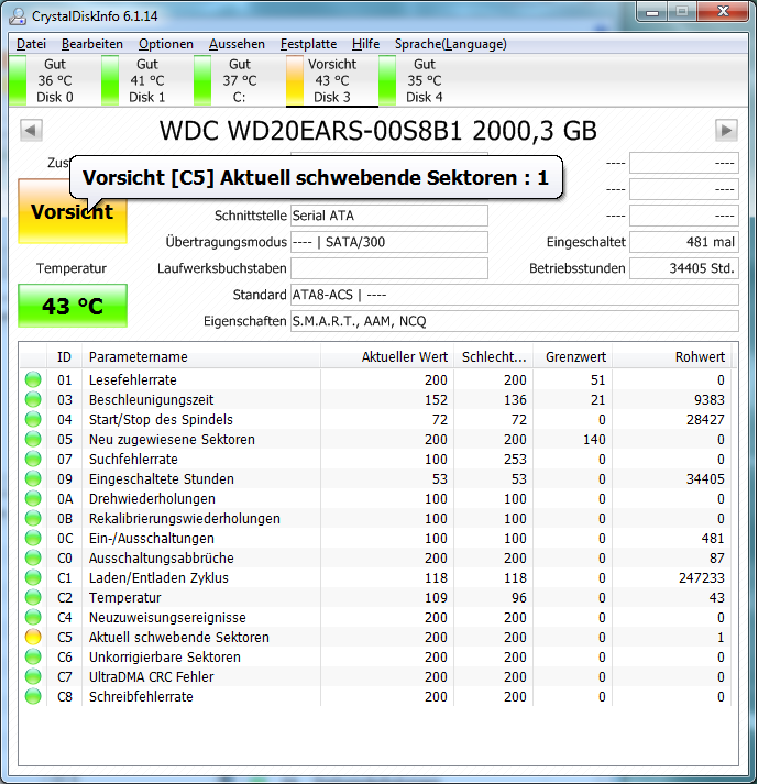 ich habe neulich im BIOS beim Starten eine S.M.A.R.T. Warnung bekommen und mit CrystalDiskInfo ergibt sich folgendes Bild: