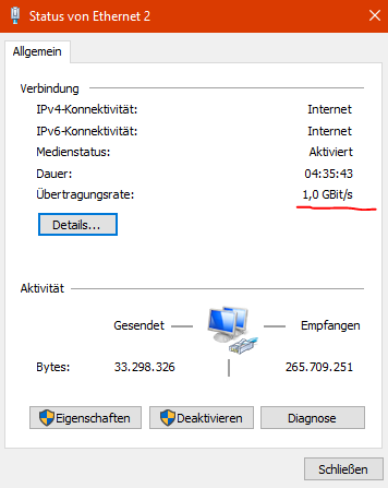 Aber als gebranntes Kind – lieber mal den Laptop in den Keller tragen, und das Kabel einem Geschwindigkeitstest unterziehen. Gesagt getan – Grinsen ist wieder weg - max. 99Mbit sagten mehrere Speedtests.