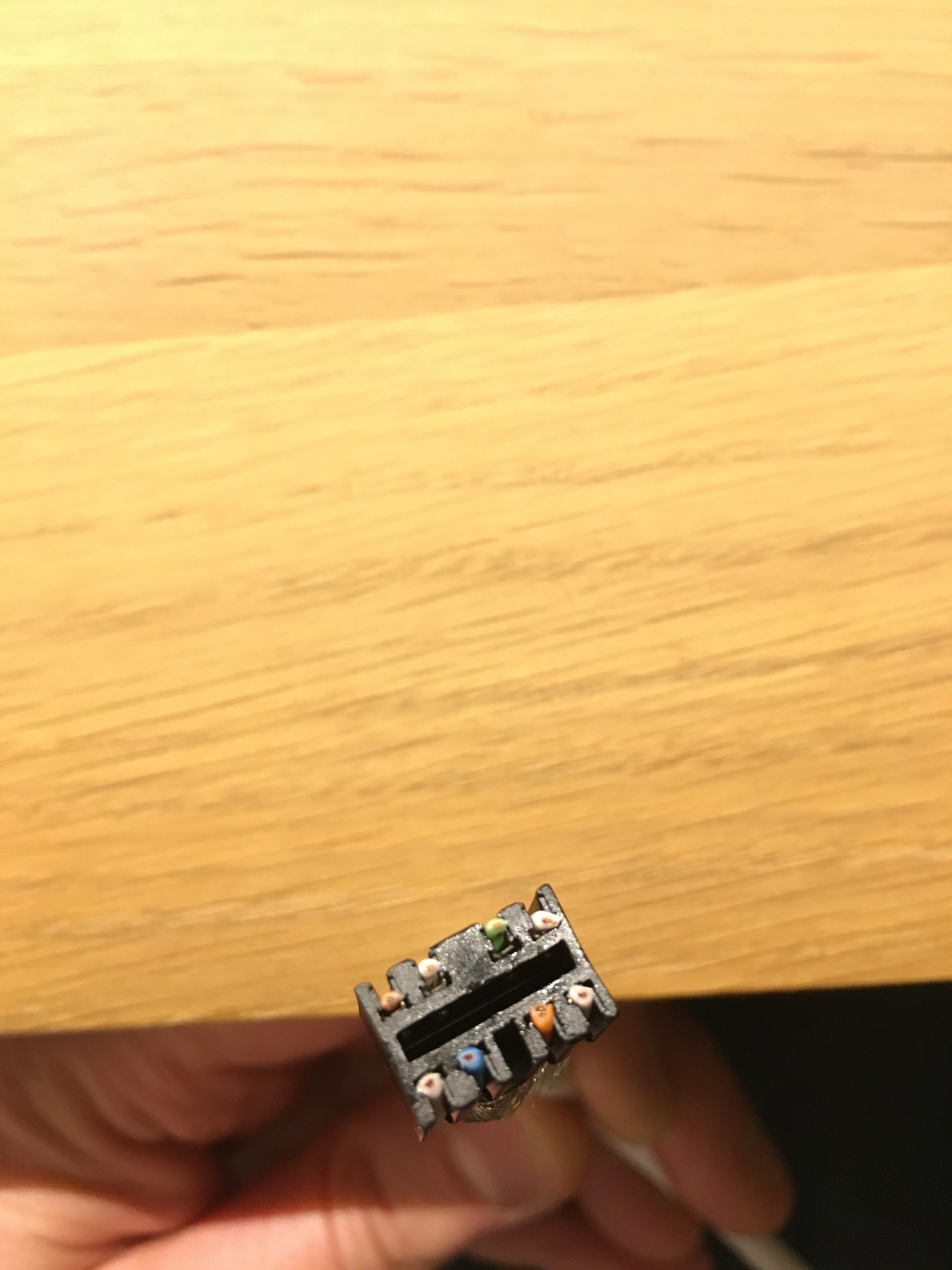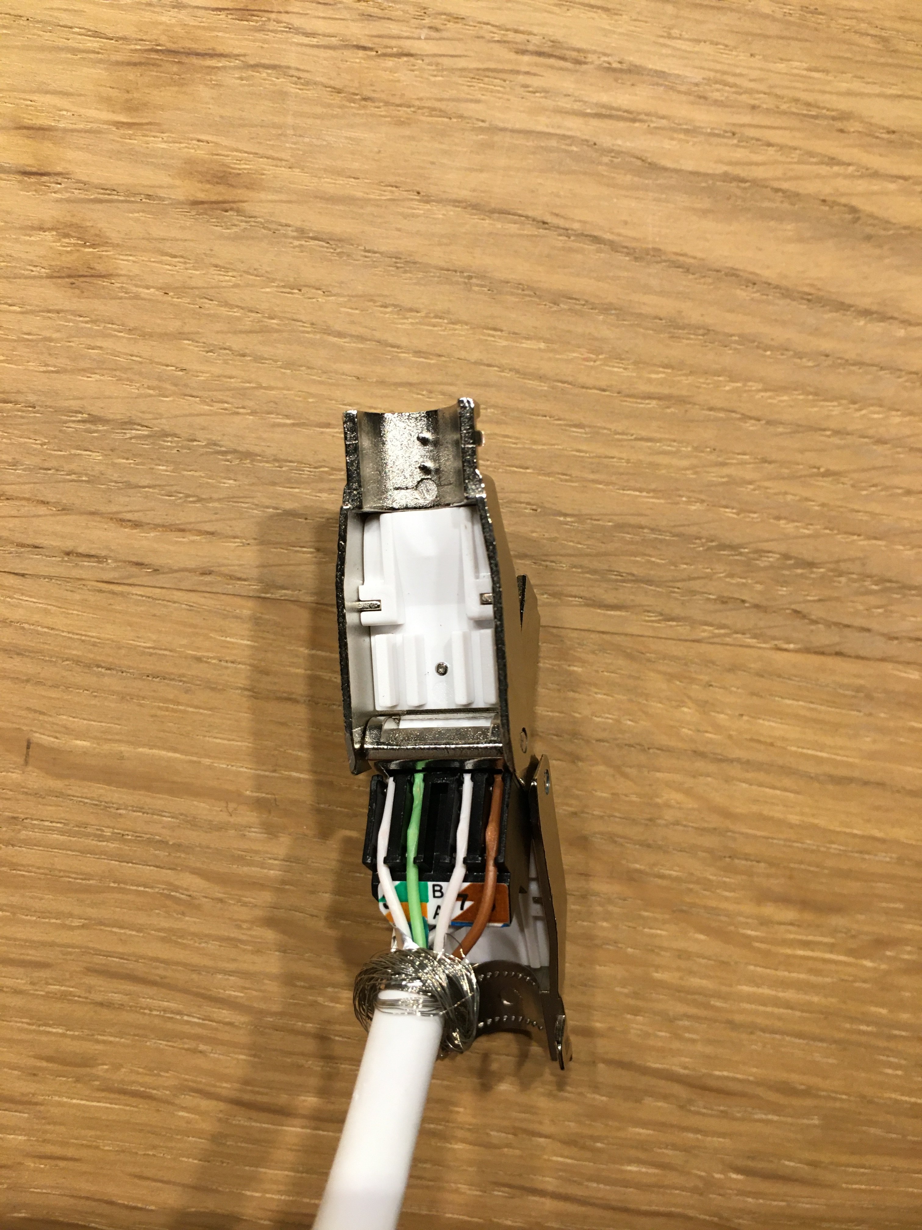 Gerade angeschlossen – hey das ist ja viel einfacher, weniger Gefummel, sogar ich habe es auf anhieb hinbekommen. LAN-Kabeltester angeschlossen, alle 8 Adern sind korrekt angeschlossen.