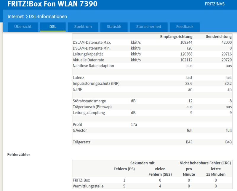 Interessant. Im unterliegenden Screen sind bei mir in der Fehlerzählertabelle Vermittlungsprobleme gesichtet. Sie sind konstant und haben Auswirkung auf den Upload. Denn die Senderichtung ist identisch mit deinem Screen. Erstmal unabhängig vom Download ist die Fritzbox dafür wohl nicht verantwortlich.