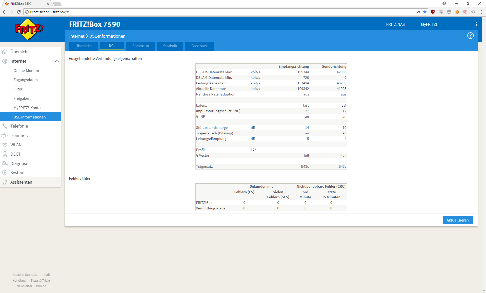 DSL ist verfügbar (DSL-Synchronisierung besteht mit 109342/41998 kbit/s).