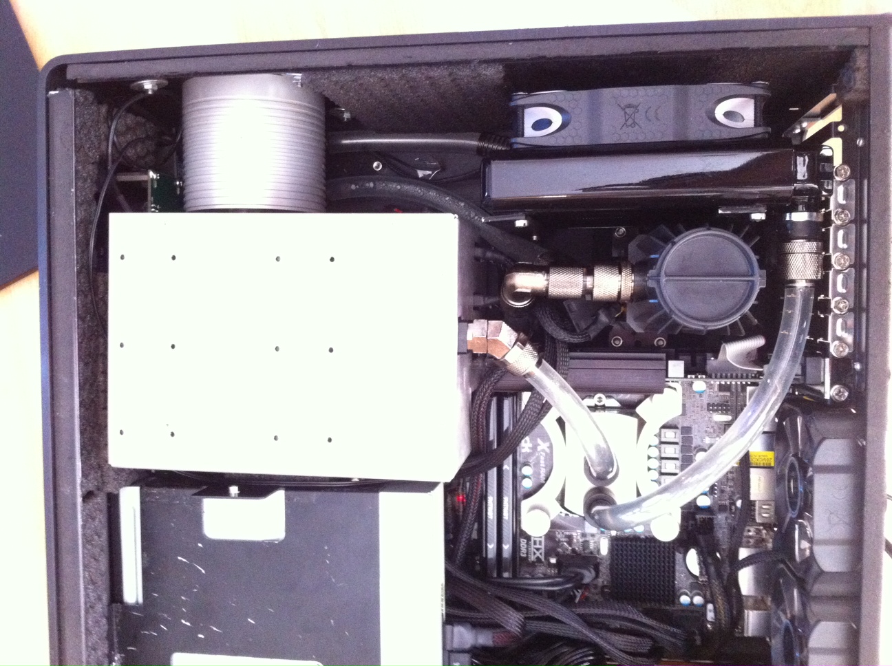 Das Wasser wird von der Pumpe (Innovatek PCPS) direkt vom AGB (Aquatube mit EIN und AUS auf der Unterseite) angesaugt, fließt dann überall durch und wird dann vom Radiator wieder zum AGB geleitet. Bzw. SOLLTE es fließen.
