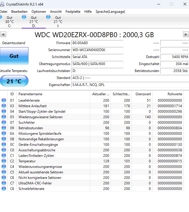 Ich versuche noch die SMART Werte zu verstehen, überall steht immer 100/100 oder 200/200, worauf muss man denn nun genau achten, welche Werte muss man im Auge behalten? Bzw. wo steht der Sollwert? Wie seht ihr denn CRC Fehler wenn bei aktuell und schlechtestem Wert nut 200/200 steht, das steht aber bei allen Platten? Bei ausstehenden Sektoren und nicht korrigierbare Sektoren auch 100/100. Ich versteh es einfach nicht