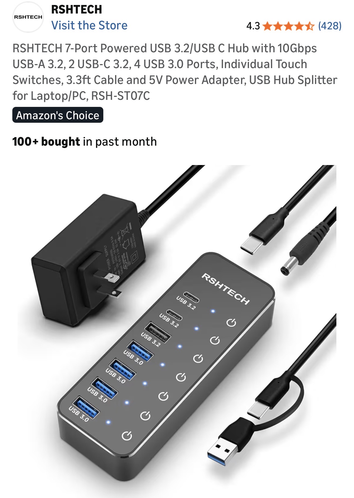 Da ich die restlichen Ports nun mittlerweile alle permanent belegt habe und gelegentlich auch mal ein 7. Gerät angeschlossen werden soll, benötigt ich nun einen neuen, größeren Hub, der Puffer für die Zukunft hat.