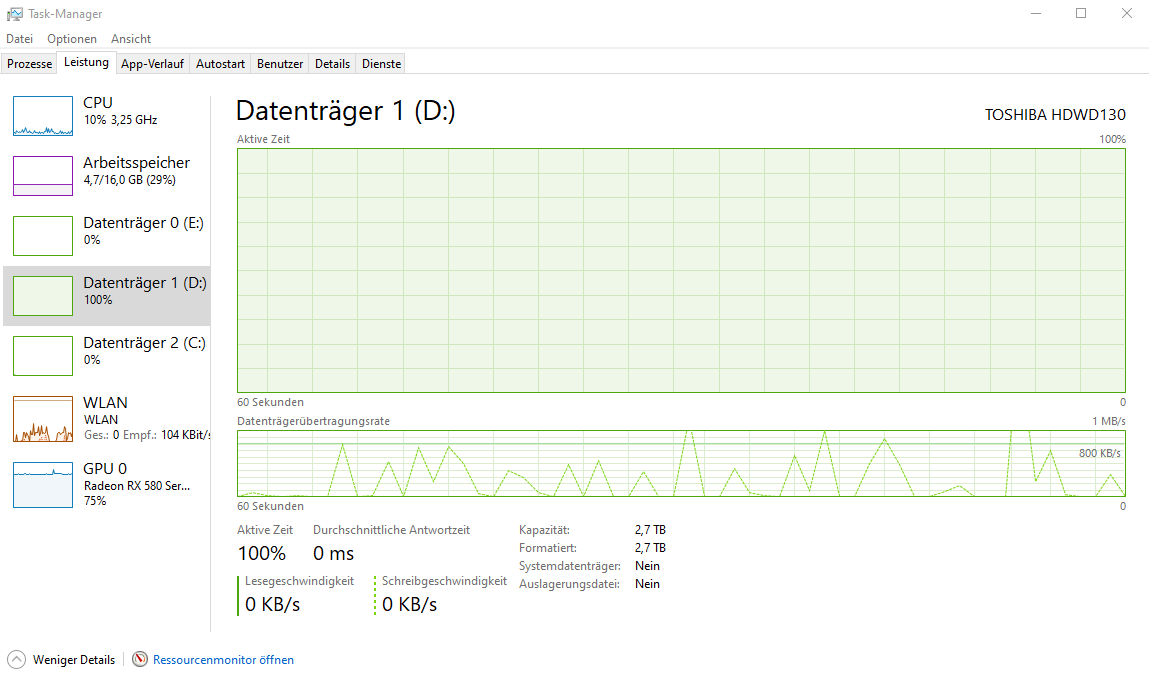 Ich fahre täglich meinen PC hoch (relativ schnell durch SSD) und 5min nach dem hochfahren steigt die Auslastung auf 100%, allerdings nur auf Festplatte D. Der Rest is normal. Alles was auf dieser Festplatte an Programmen gespeichert ist reagiert logischerweise nicht mehr. Selbst Windows und der Taskmanager reagieren nach gewisser Zeit nicht mehr. Was aber immernoch Problemlos funktioniert ist bspw Google Chrome (gespeichert auf C, also der SSD), was für mich bedeutet das sich das Problem rein auf Festplatte D beschränkt.