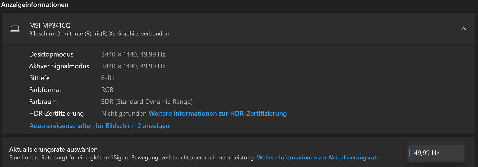 Wenn ich den Monitor über den USB-C zu HDMI verbinde, bekomme ich 59,99 Hz aber nur im Akkumodus des Notebooks ein scharfes Bild. Betreibe ich das Notebook im Netzbetrieb, wird das Bild vom Monitor eher gräulig und sieht nicht mehr nutzbar schön aus.