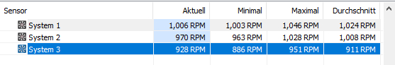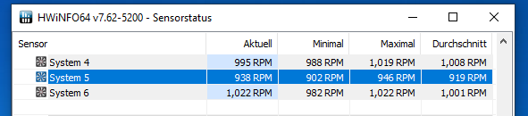 Auch, wenn ich den 1000 rpm Lüfter an SYS_FAN 4 Stecke bleibt er der langsamste. Klar, die Unterschiede der Umdrehungen sind jetzt nicht riesig, dennoch würde ich gerne wissen, warum dies geschieht, dass der eigentlich schnellste Lüfter, der mehr rpm drehe kann der langsamste ist. Selbstverständlich sind alle Lüfter auf die gleiche Spannung eingestellt.