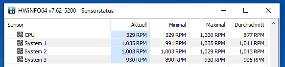Das kuriose nun ist: Die zwei vom Hersteller vorinstallierten laufen jeweils mit 900 rpm, der neue mit 1000 rpm. Die drei Lüfter sind jeweils an SYS_FAN 1, SYS_FAN 2 sowie SYS_FAN 3 direkt am Mainbord angeschlossen. Der neue Lüfter, der am dritten Anschluss hängt, läuft aber mit Abstand am langsamsten. Müsste es nicht eigentlich so sein, dass die beiden mit 900rpm langsamer laufen als der neue mit 1000 rpm? Kann mir das jemand logisch erklären oder stimmt hier etwas nicht?