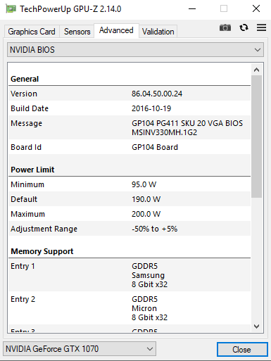 CPUZ zeigt auch eine 1070 an, aber nur CORE (Core, Shader ausgegraut, Memory alles mit komplett underclockten Werten) und Memory (Size, Type, Vendor).
