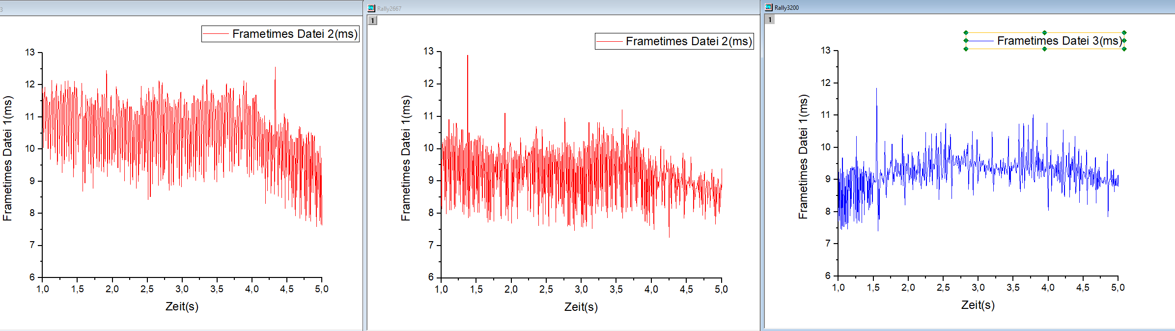 Es gab daher 6 Statistikdateien, von denen ich jeweils die verschiedenen Ram Geschwindigkeiten zu den ersten 60s des Benchmarks und den ersten 60s des selbst fahrens übereinander gelegt und gespeichert habe....