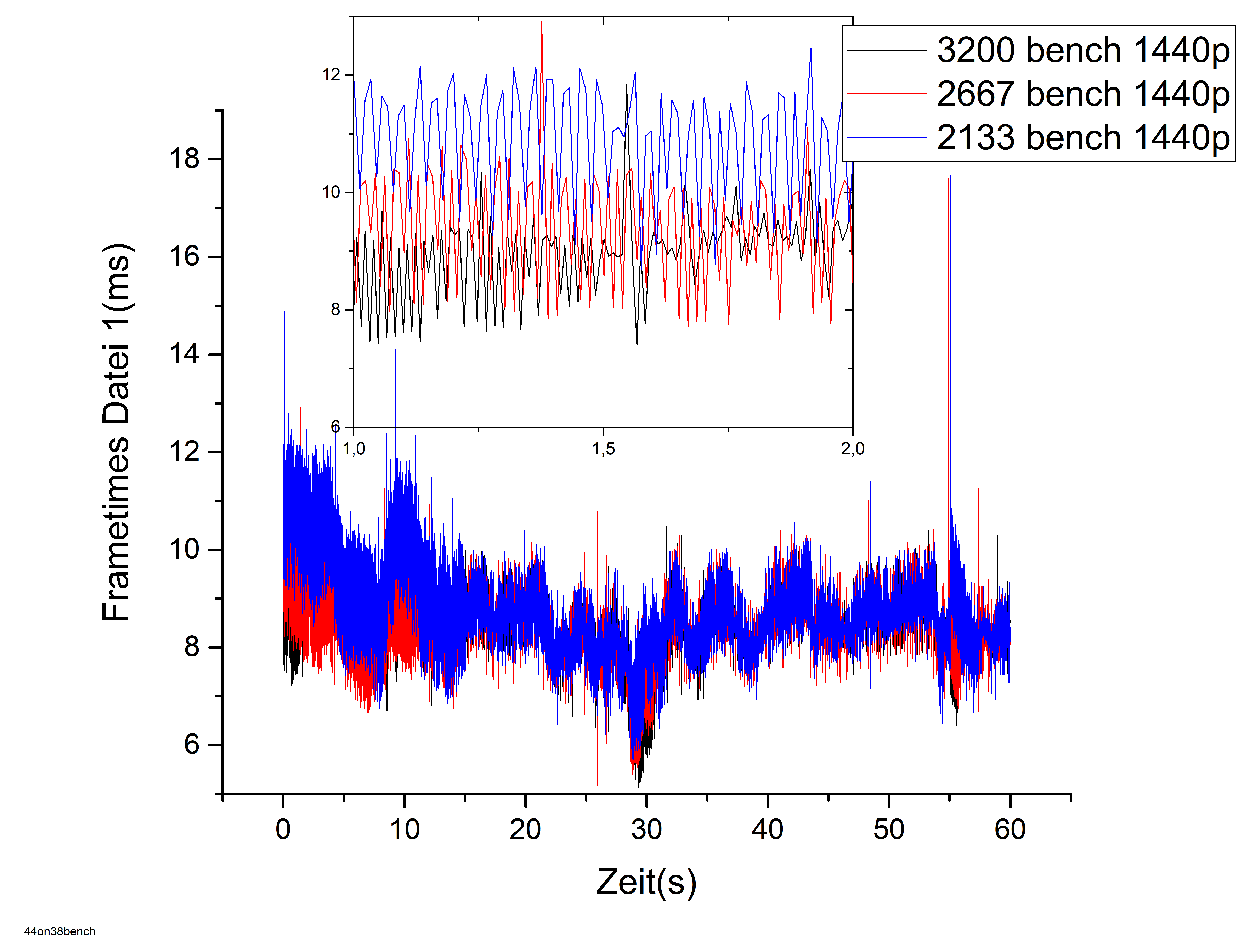 Hier die ganze Fraps Messung über 60s (alle übereinander) und damit man was erkennen kann ein Inset mit nur einer Sekunde: