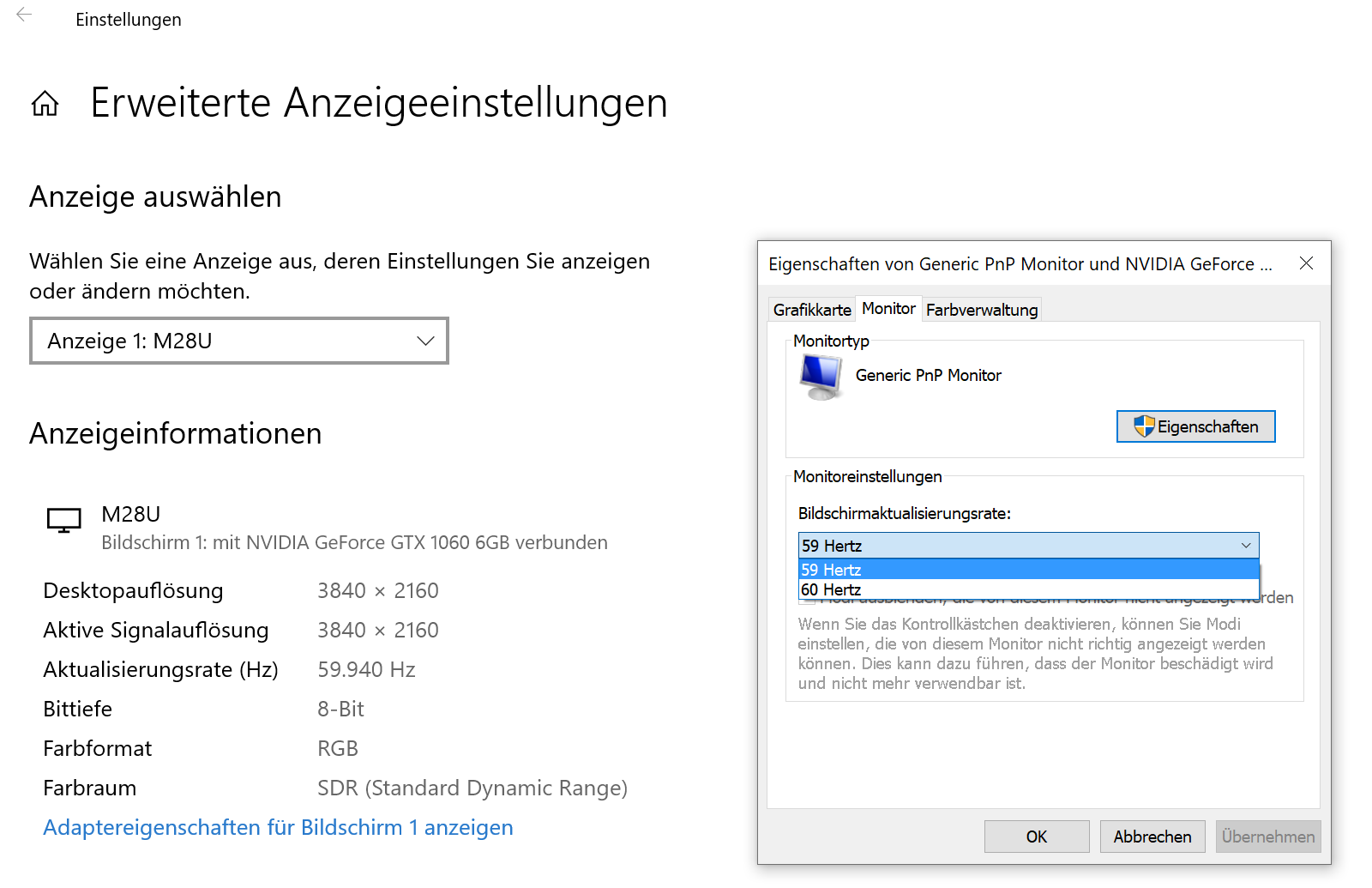 Ich habe den brandneuen Gigabyte-Monitor M28U gekauft und jetzt das erste Mal angeschlossen. Ich bekomme mit meiner Geforce RTX 1060 nur 60 Hertz hin, egal ob HDMI- oder DisplayPort-Kabel. Diese unterstützt zwar nur 120 Hertz, aber selbst diesen Wert kann ich nirgendwo aktivieren. Was mache ich falsch? Laut Anleitung sollten 120 Hz bei beiden Anschlüssen möglich sein. Im Windows-Menü bei "Monitor" kann ich im Dropdwon nur 60 Hertz auswählen. Das Monitor-Menü bietet auch keine entsprechende Einstellung den Wert zu ändern.