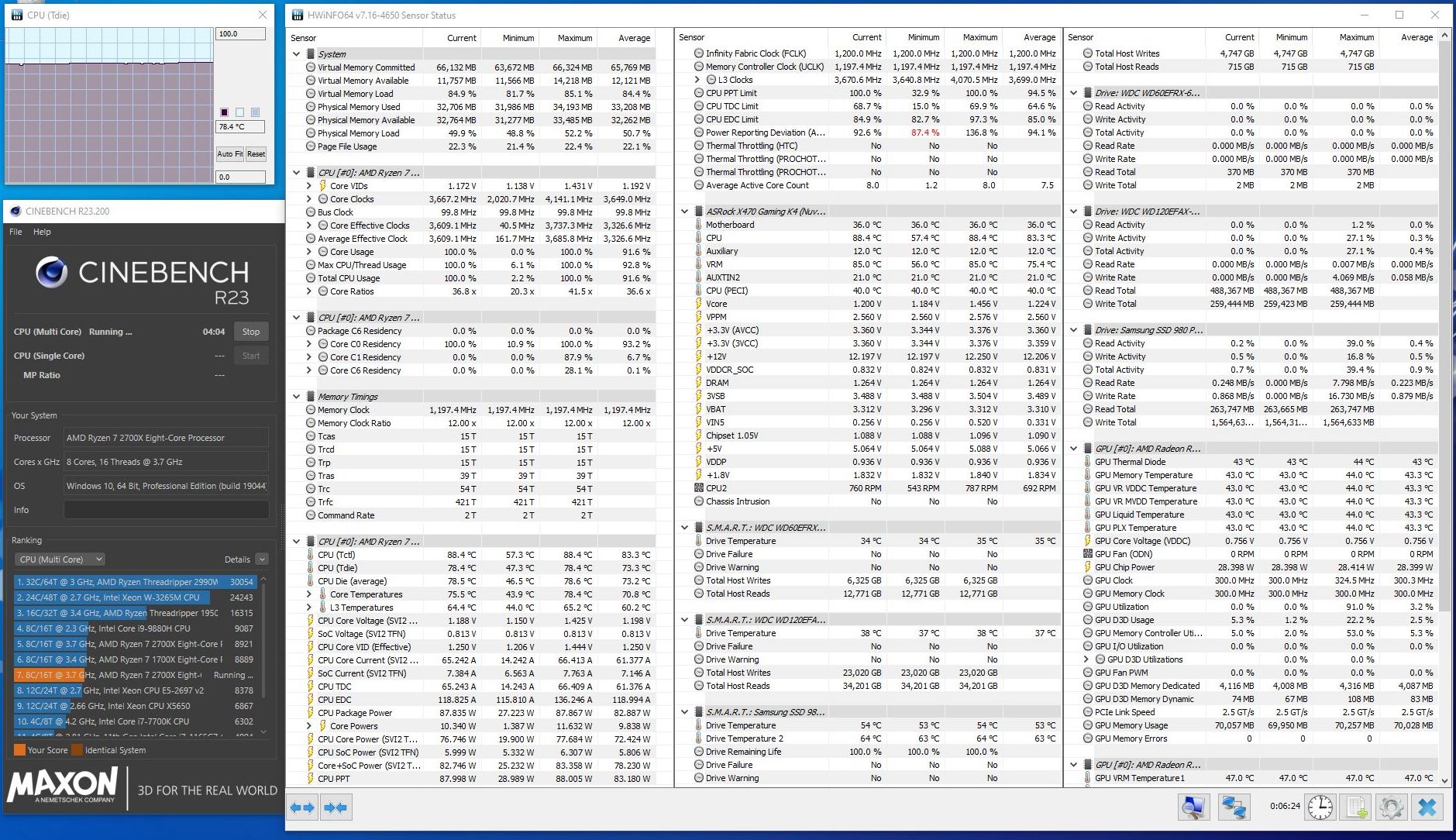 okay hab ich gemacht...hoffe es ist jetzt besser ersichtlich ?Nixdorf schrieb:Bitte klicke in HWiNFO auf die Uhr unten rechts, warte 20 Sekunden, starte dann den Cinebench, und fertige bei laufendem Benchmark einen Screenshot an, während der Countdown in Cinebench unter 8 Minuten gesunken ist. Das liefert dann auswertbare Daten.