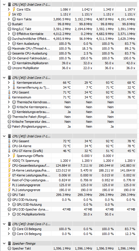 Kann ich dir nicht sagen, weil der rechte Screenshot nicht zur Anforderung passt. Der Durchschnitt für "Kerntemperaturen" ist mit 58°C sehr niedrig. Die Messung zeigt unten rechts aber auch 14 Minuten als Zeitraum an. Da können eventuell zwei Drittel der Messung aus dem Idle sein. Das ist nicht gesucht. Wichtig wäre, dass der Zeitraum, in dem HWiNFO misst, sich zu fast 100% auf den laufenden Cinebench bezieht. Außerdem ist bei "Aktuell" unter CPU-Gesamtleistungsaufnahme nur 8W zu sehen. Da wird der Screenshot wohl nach dem Benchmark angefertigt worden sein. Da kann man nicht sauber erkennen, ob die 125W auch sauber eingestellt werden.painful schrieb:ich hoffe es ist alles im grünen Bereich