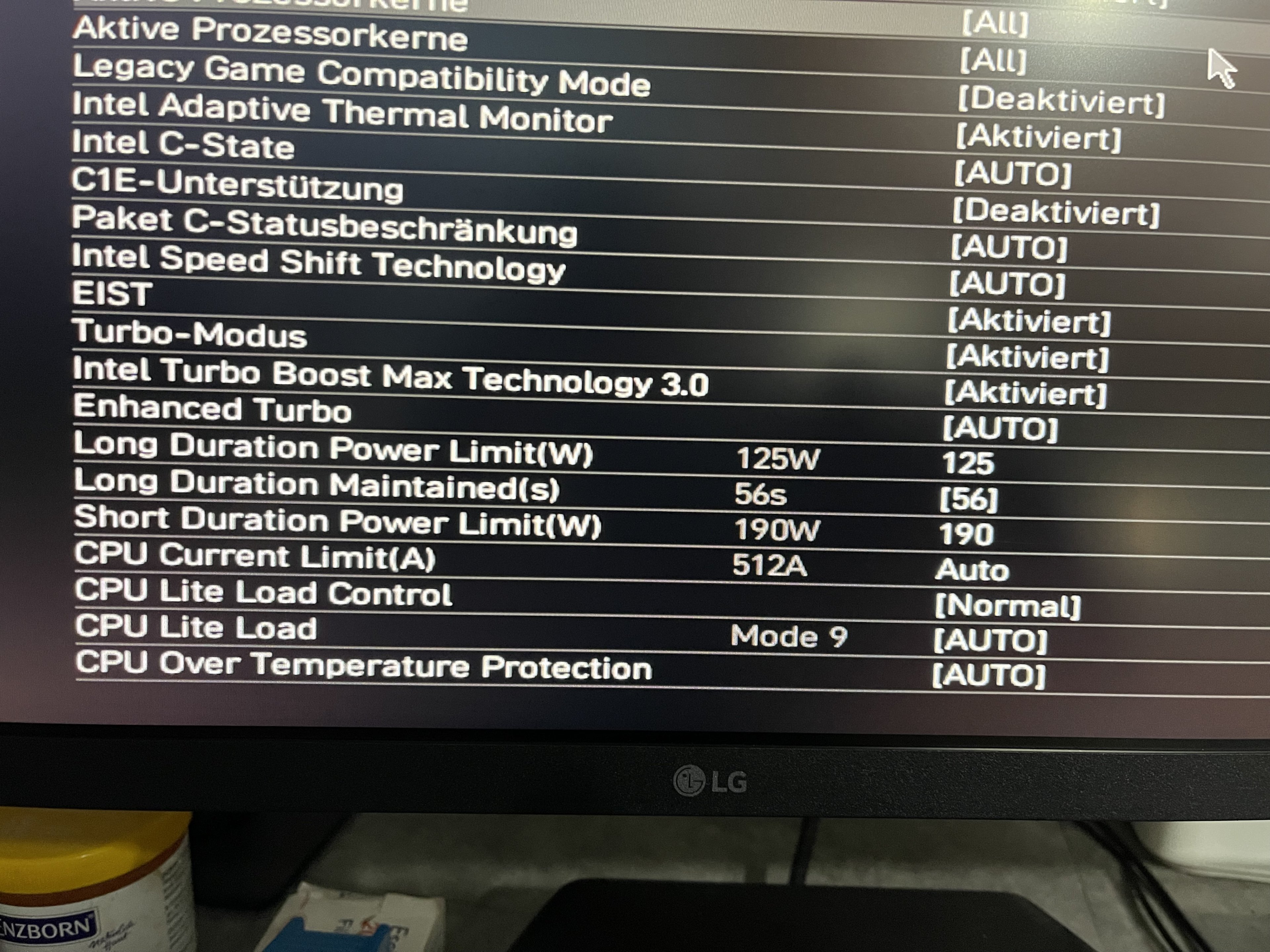 also diese Werte trage ich jetzt mal ein.... PL1=241 PL2=125 und Tau 56s.... melde mich gleichNixdorf schrieb:Kein Wunder, wenn PL1 und PL2 auf 4096W stehen. Die Power Limits wurden im UEFI auf unlimitiert gestellt. Hatte sich da beim ersten Aufruf des UEFI ein Dialog gemeldet, der nach der Kühlerart fragt (hier, Bild 11)? Das ist jedenfalls die Einstellung für Custom-Wakü. Dabei ist schon die Einstellung für den bei dir nicht vorhandenen Boxed Cooler zwar nach Intel-Angaben okay, aber nach dem ComputerBase-Test unangemessen hoch. Empfohlen wird PL1=241W, PL2=125W und Tau=56s.