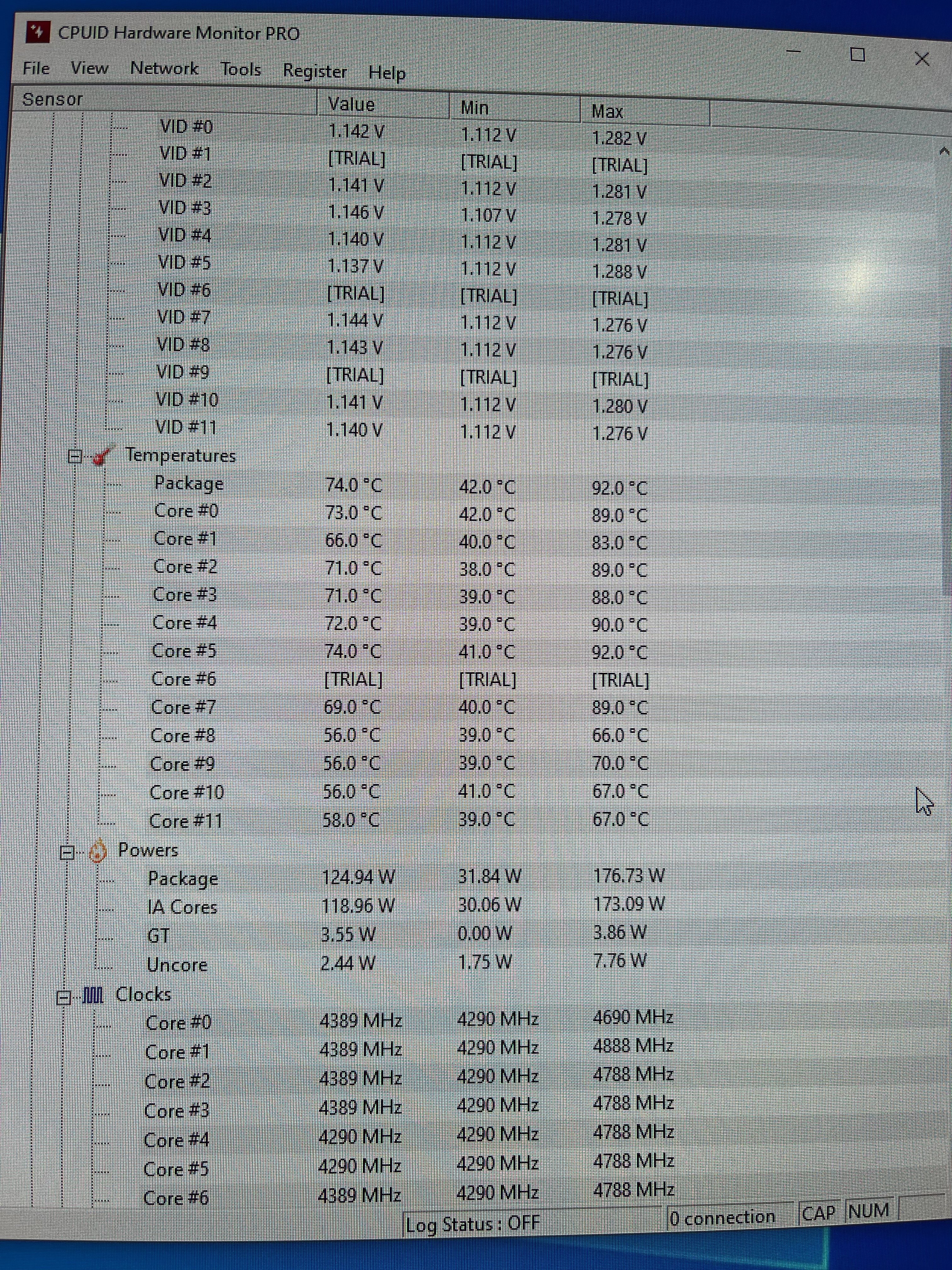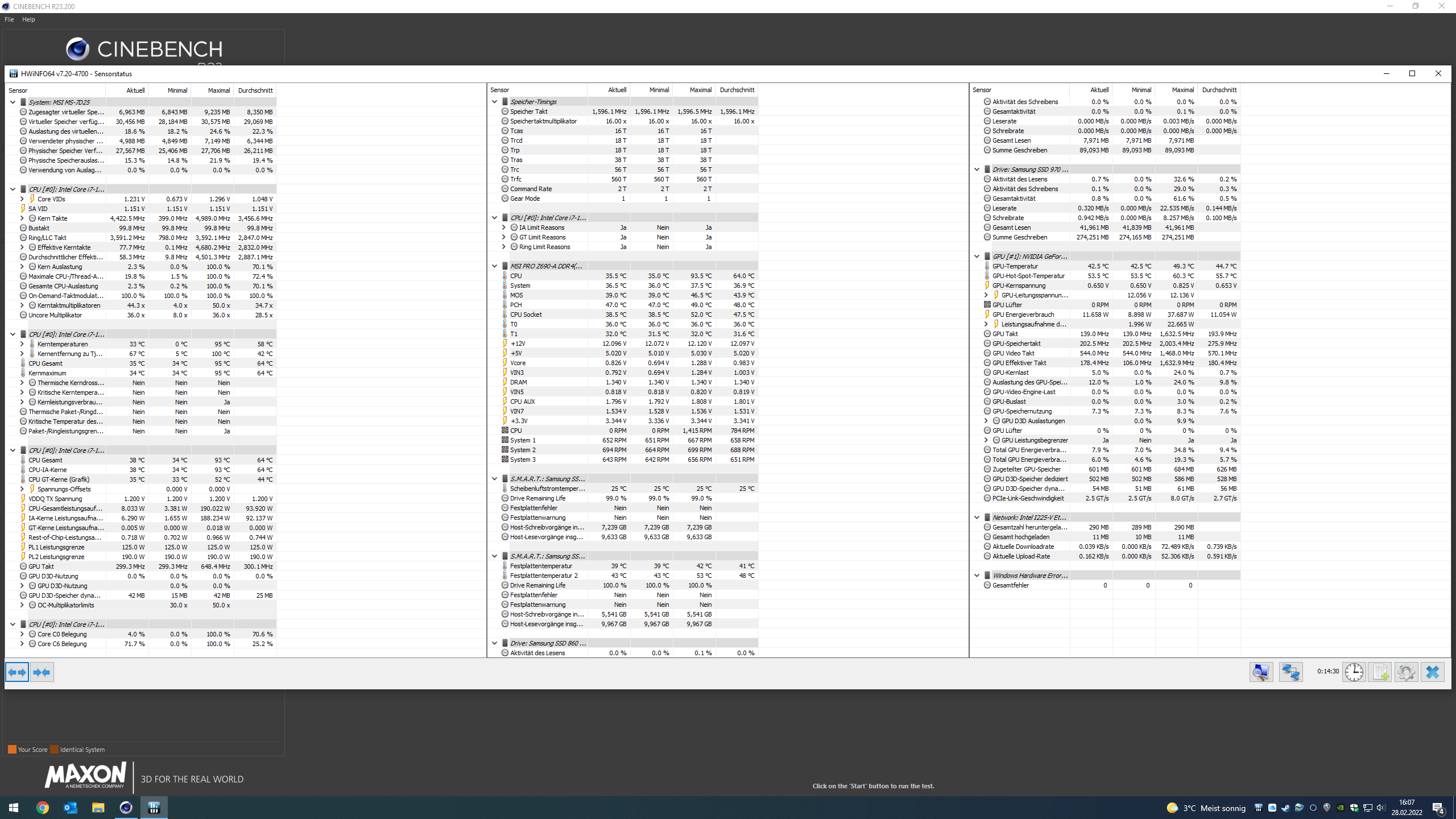 Bitte klicke in HWiNFO auf die Uhr unten rechts, warte 20 Sekunden, starte dann den Cinebench, und fertige bei laufendem Benchmark einen Screenshot an, während der Countdown in Cinebench unter 5 Minuten gesunken ist. Das liefert dann auswertbare Daten.