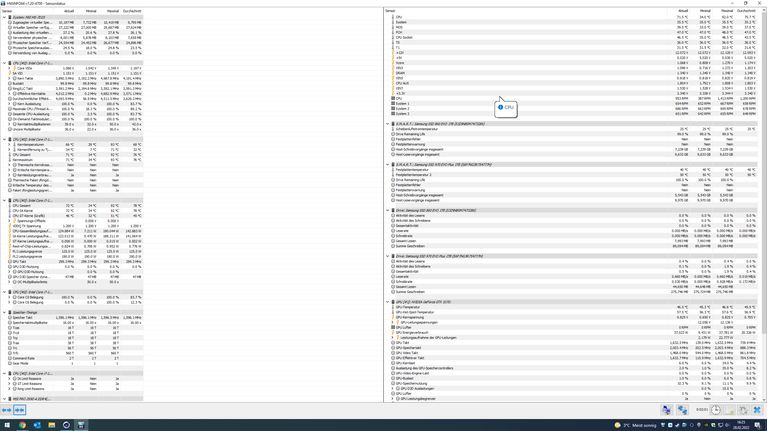 Das ist während Last aufgenommen, die CPU nimmt aktuell genau die gewünschten 125W auf, die ihr nach Ablauf der ersten 56s zustehen. Die Temperatur liegt aktuell bei 72°C und damit völlig im grünen Bereich. Der Durchschnitt ist von den 92°C Maximum schon auf 78°C abgesunken. Der Dark Rock 4 kommt also gut damit klar. Ich sehe auch, dass der RAM mit 3200 läuft, was hoffentlich auch zu deinen Modulen passt.