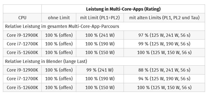 Du kannst da auch selber was Niedrigeres als 190W für PL2 wählen. Hangel dich so lange 10W runter, bis der Cinebench mit deinem Dark Rock 4 nicht über 85W kommt, oder welchen Wert auch immer du für noch okay empfindest. Das ist dann das passende Limit für deine Konfiguration. In Spielen wird auch das sehr wahrscheinlich kaum einen Unterschied machen, und in lang laufenden Dauerlast-Anwendungen reden wir über wenige Prozent. Die verlinkte Tabelle oben zeigt ja, dass Blender mit langer Last nur 6% einbüßt, wenn die CPU auf 125W läuft.