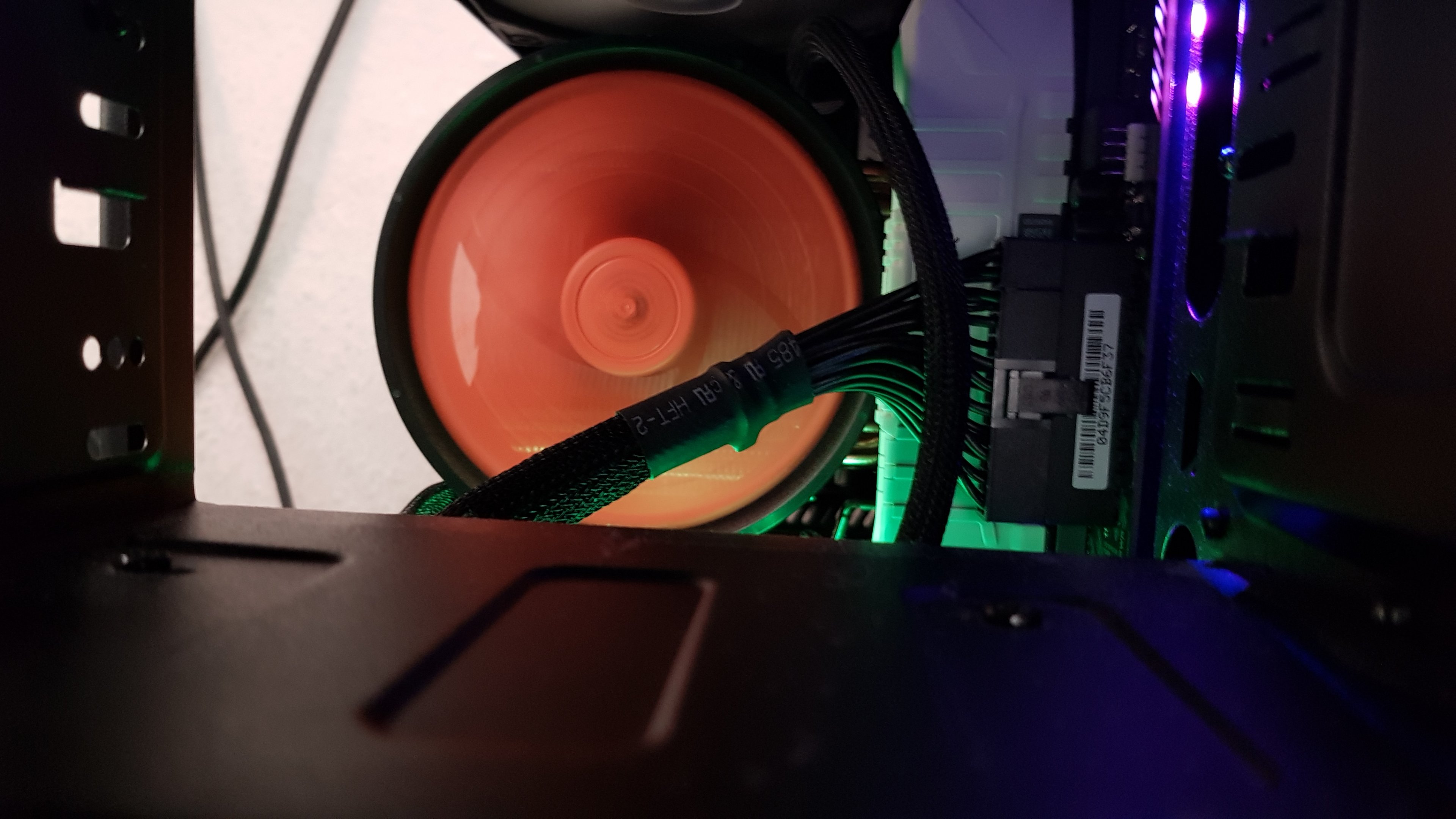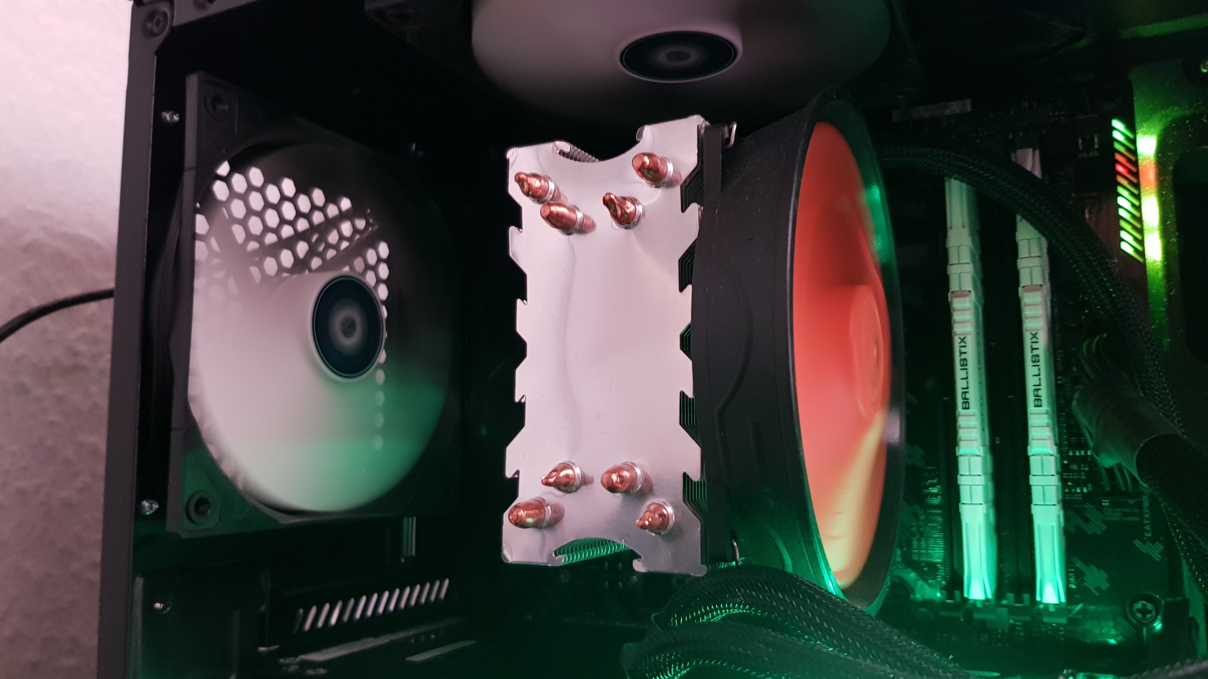 Da hätte ich den zweiten Lüfter eher auf der anderen Seite des Kühlkörpers so befestigt, daß er mehr Luft nach hinten schaufelt. An der Gehäusedecke, ohne Frischluftzufuhr, halte ich das ganze jedenfalls für relativ sinnfrei.