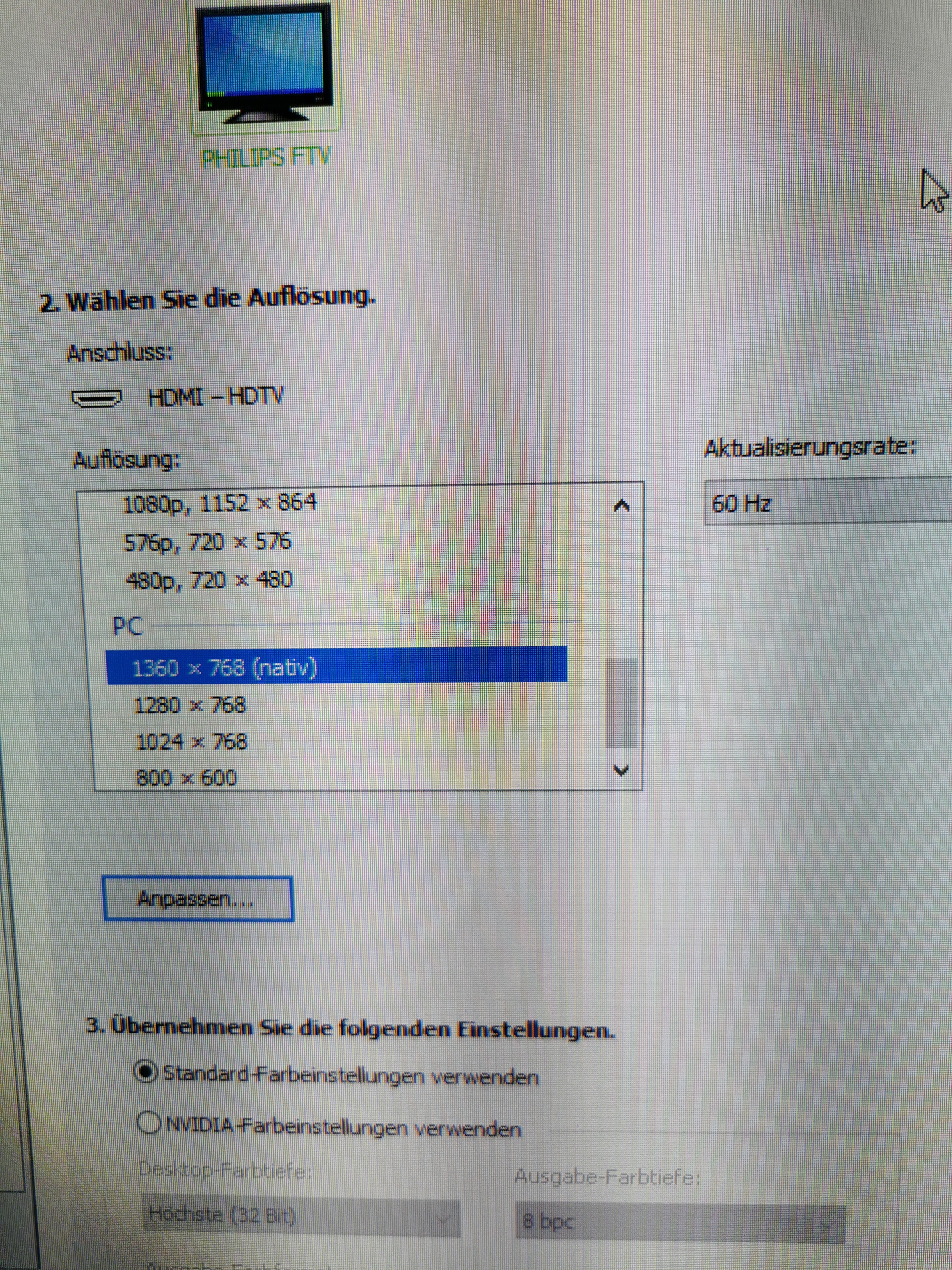 Also folgendes ich habe grade gesehen das mein PC nur eine Bildschirmauflösung von 1360x768 vorschlägt ich habe einen full HD Monitor von Phillips genaues Modell weiß ich leider nicht