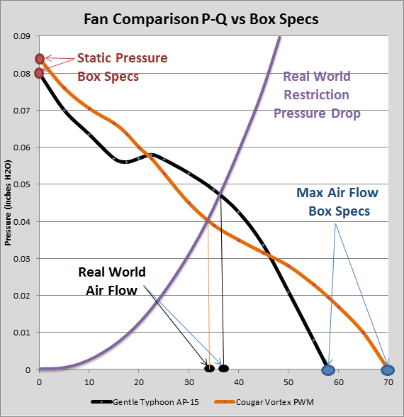 Die beiden Leistungspunkte für den folgenden Vergleich wurden auf 0,3 und 0,45 m/s gesetzt. Auf die zum Tragen kommende Kühlfläche des Lüfters bezogen entspricht dies etwa einem Fördervolumen von effektiv 14 bzw. 21 m3/h.