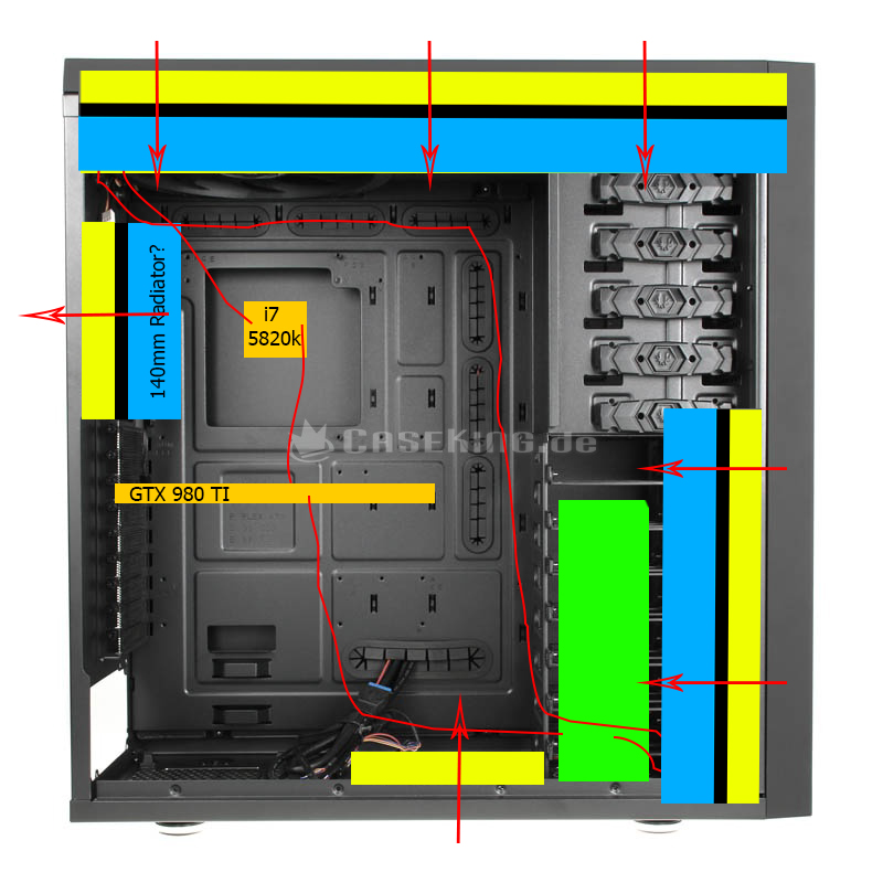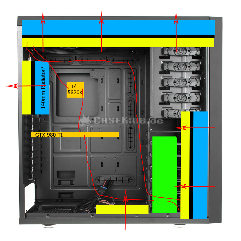 habe vor kurzem mein Projekt (Bitfenix Shinobi XL) fertiggestellt. Momentan verbaut ein NexXxoS ST30 (420), NexXxoS XT45 (280). Die drei Noctua NF-P14s des 420er pushen, die zwei des XT45 ziehen "frische" Luft hinhein. Im Boden habe ich einen 120mm der ebenfalls für Frischtluft sorgt. Der 140mm an der Rückseite pusht.
