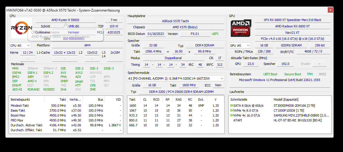3200'er cl14 (b-dies) @stock + 5900x @stock (Habe zur Zeit meine "ich schone die Hardware"-Phase und betreibe alles stock, keine Lust auf evtl. späte Überraschungen-Phase)