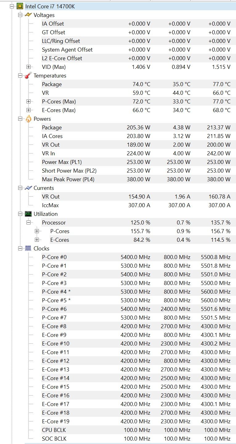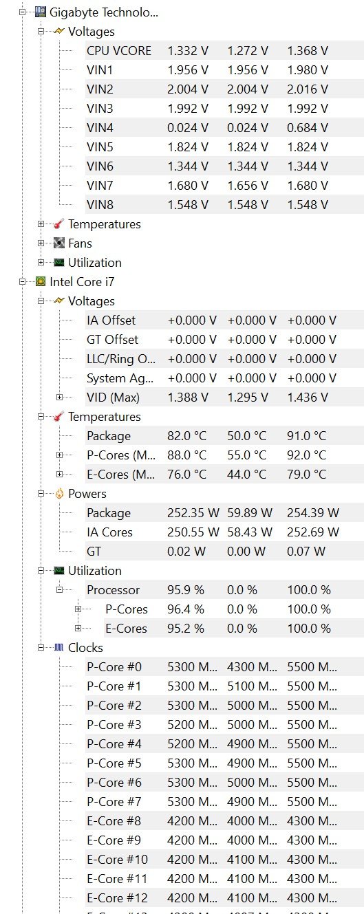 Bios update auf neueste Version (inkl. CPU Fix) + zurücksetzen aller settings (vorher 12700k). Manuelles setzen PL1 + PL2 auf 125 bzw. 253 Watt. Windows Energiersparmodus auf ausbalanciert. Aktueller Testlauf alles auf Auto.