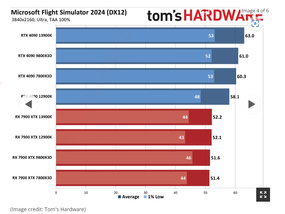 9800X3d und 14900KS nutzen beide die gleiche GPU, also gleiches GPU-Limit und trotzdem ist gerade auf den letzten Metern der Auflösung in 4K die KS CPU schneller. Der MSFS 2024 skaliert bekanntlich anders als der Vorgänger (der noch stark vom erweiterten Cache des Ryzen profitierte), hier sind jetzt Mehrkerner gefragt, sprichwörtlich überholt selbst der i9 13900K in 4K den 9800X3d! Das ist aber wohl auch ein anderes Feld. https://www.tomshardware.com/video-...#section-flight-simulator-2024-cpu-benchmarks