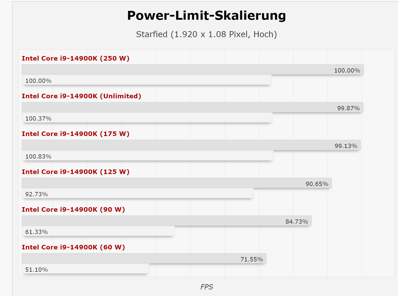 Dem stimme ich zu, aber ich glaube, dass echte ´Freaks´, die das beste haben wollen, sich nicht damit zufrieden geben. Ich bin sicher, dass mehr als so einige 5090 Käufer sich sicher nicht über ihre 4090 beschwert haben, aber sobald sie wissen, es gibt etwas besseres, dann packt es sie und nur das ist für diese Käuferschicht wirklich ´Highend´:hammer_alt: Angeblich soll die CPU heute kommen, wenn die Post ihr Wort hält... Ich bin mega gespannt, diese auszuprobieren! Hier bei Hardwareluxx und Techpowerup sieht man ganz klar, wie hammer der 14900K skaliert. Wenn das stimmen sollte, dann werde ich mit meinen geplanten 170W+Undervolt nahezu immer seine vollen Kapazitäten für Games ausschöpfen können und er sollte dabei sogar ´kühl´ und damit auch leise laufen... Immer wieder lese ich Starfield haut alles weg...über 250Watt...dort 148Fps, bei 175W 147Fps.... Das ist doch kein relevanter Unterschied!! Eher bei 125W 134 Frames, aber nur bei Full HD...in 4K auch kein erwähnenswerter Unterschied und welcher Mensch -Ausnahmen gibt´s immer- mit einer 4090 spielt in der Regel nicht in 4K????...