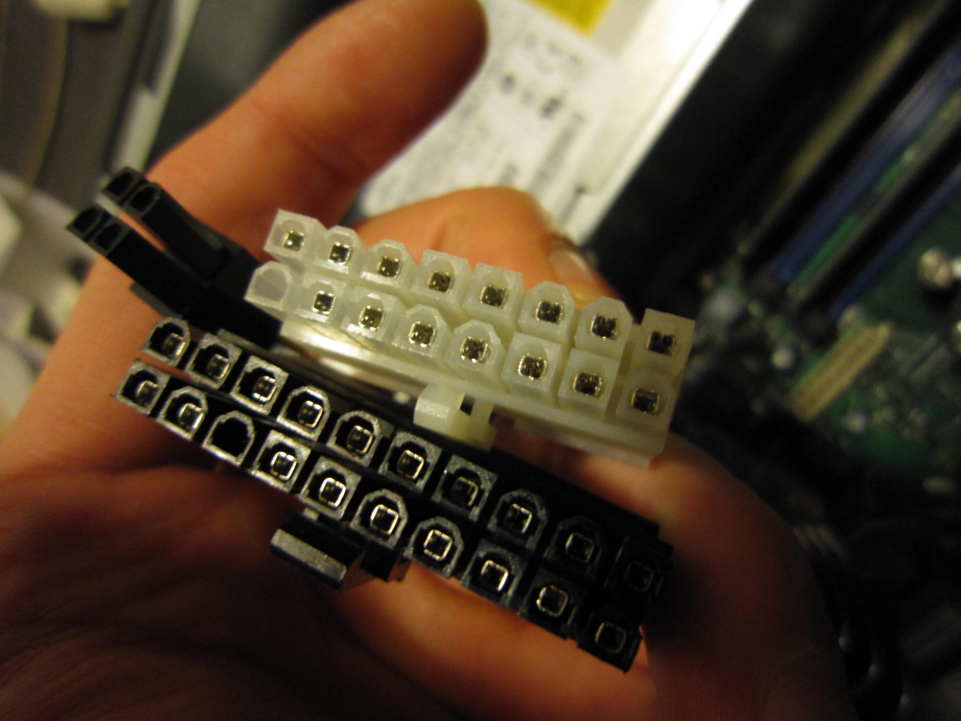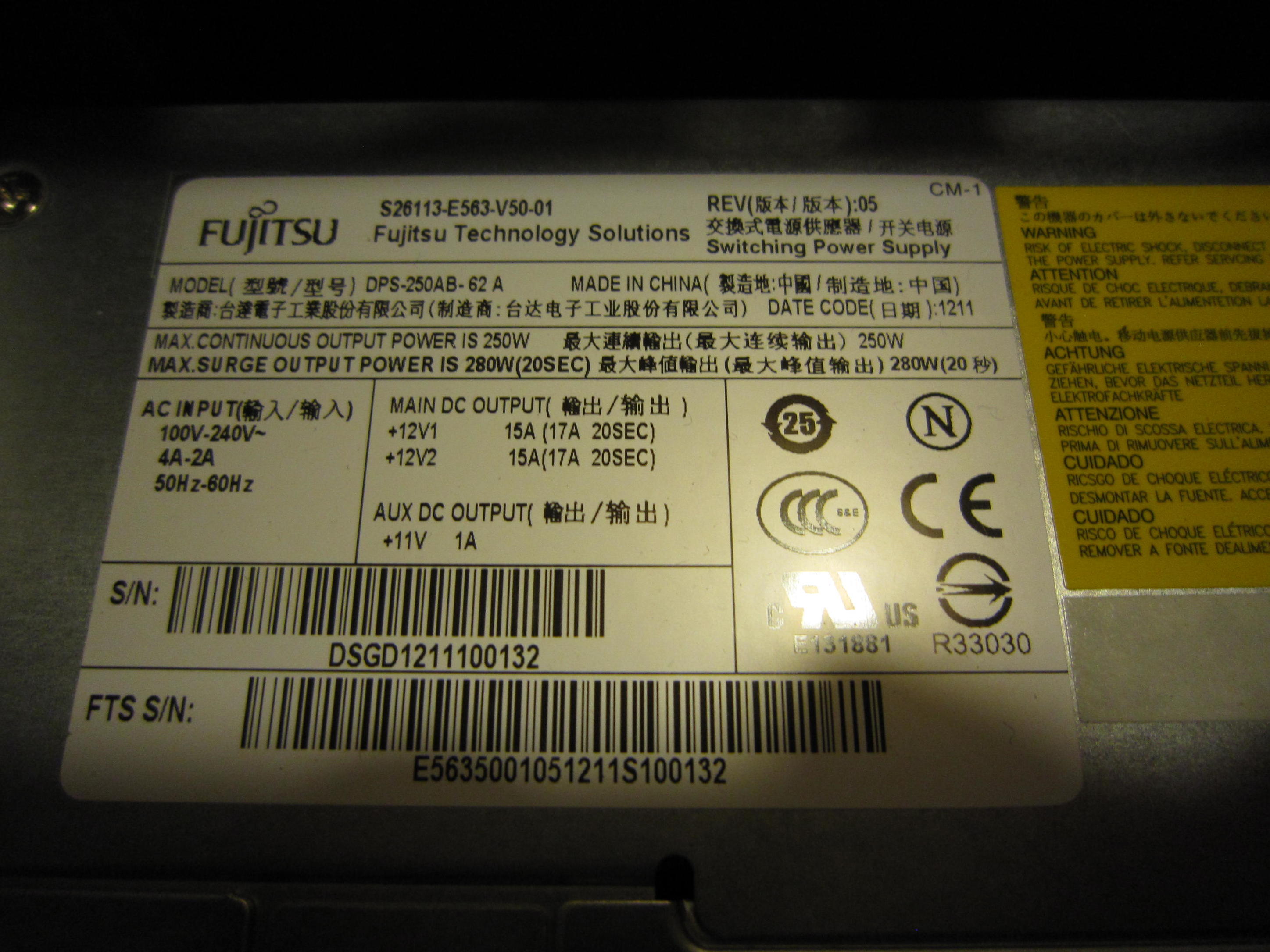 Wie auf den Bildern zu sehen, stimmen die Pins vom Fujitsu-Netzteil mit den ersten 16 Pins eines ATX-Netzteils überein. Testhalber passt das ATX-NT auch ins Mainboard, 4 (bzw. 8) pins stehen einfach über.