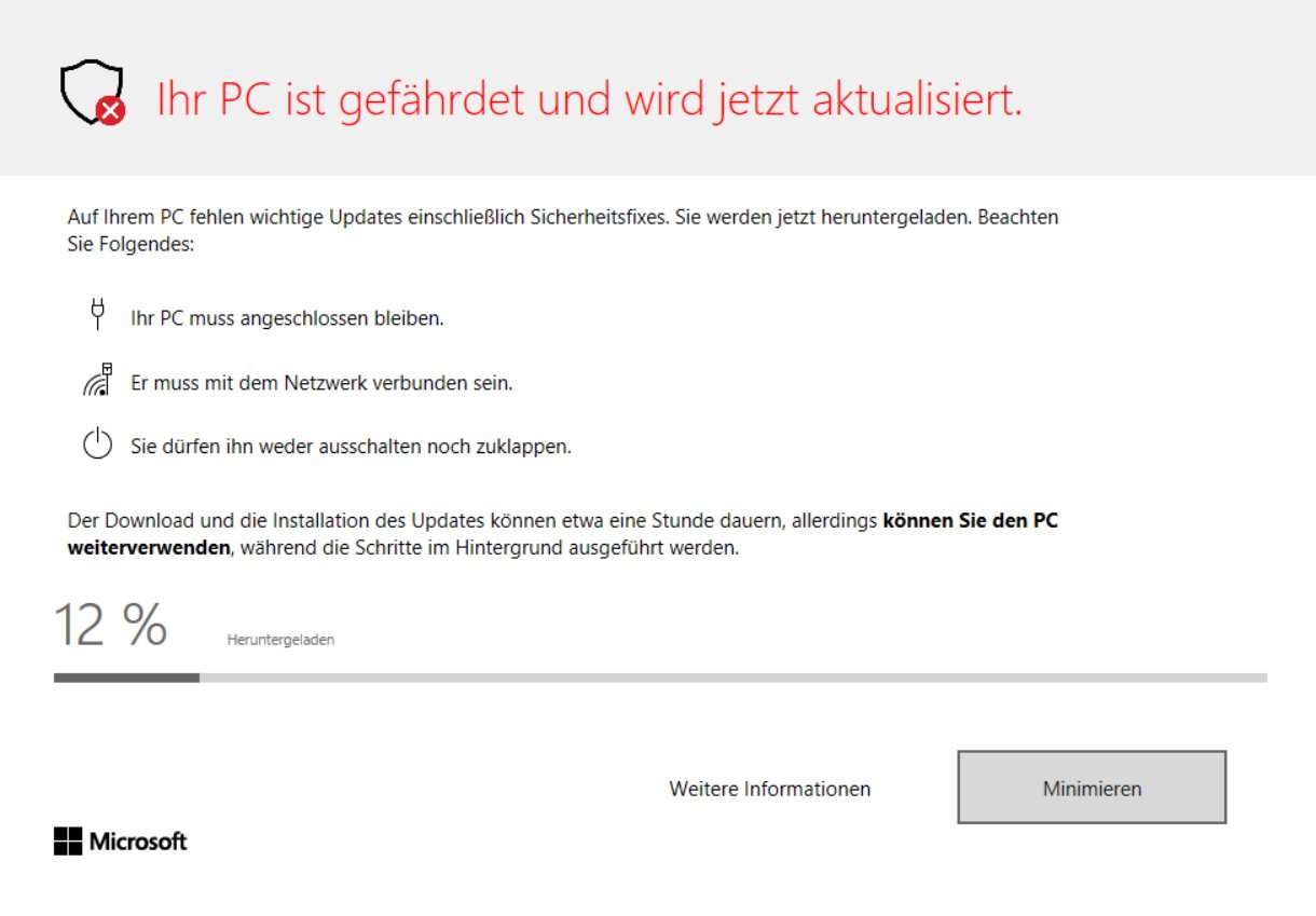 Denn jetzt im Moment läuft dieser Update-Vorgang erneut, diesmal also "im laufenden Betrieb". Der entsprechende Hinweis poppte vorhin unversehens auf, den derzeitigen Download-Vorgang kann ich leider nicht abbrechen und das Fenster nur minimieren – und beeinträchtigt zB andere eigene Downloadvorgänge, dauert zudem wie schon zuvor zweimal Ewigkeiten. Befürchte jedoch, dass auch dieser 3. Versuch, den Windows nun vornimmt, den Blue Screen (nee, nennt sich wohl in diesem Fall anders) erzeugt und Windows die vorherige/jetzige Version erneut wiederherstellen würde.