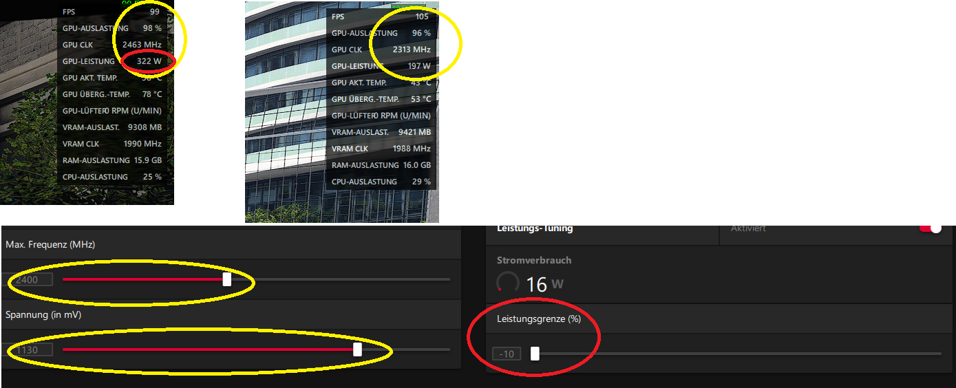 Also zumindest in F1 22 sieht es jetzt so aus (links oben das Adrenalin Overlay bei Standard-Einstellungen, rechts daneben mit Undervolting in Form von 1130 mV, 2400 max. Takt und -10% Leistung und drunter abgebildet die Adrenalin-Einstellung passend dazu). Was sagt Ihr dazu?