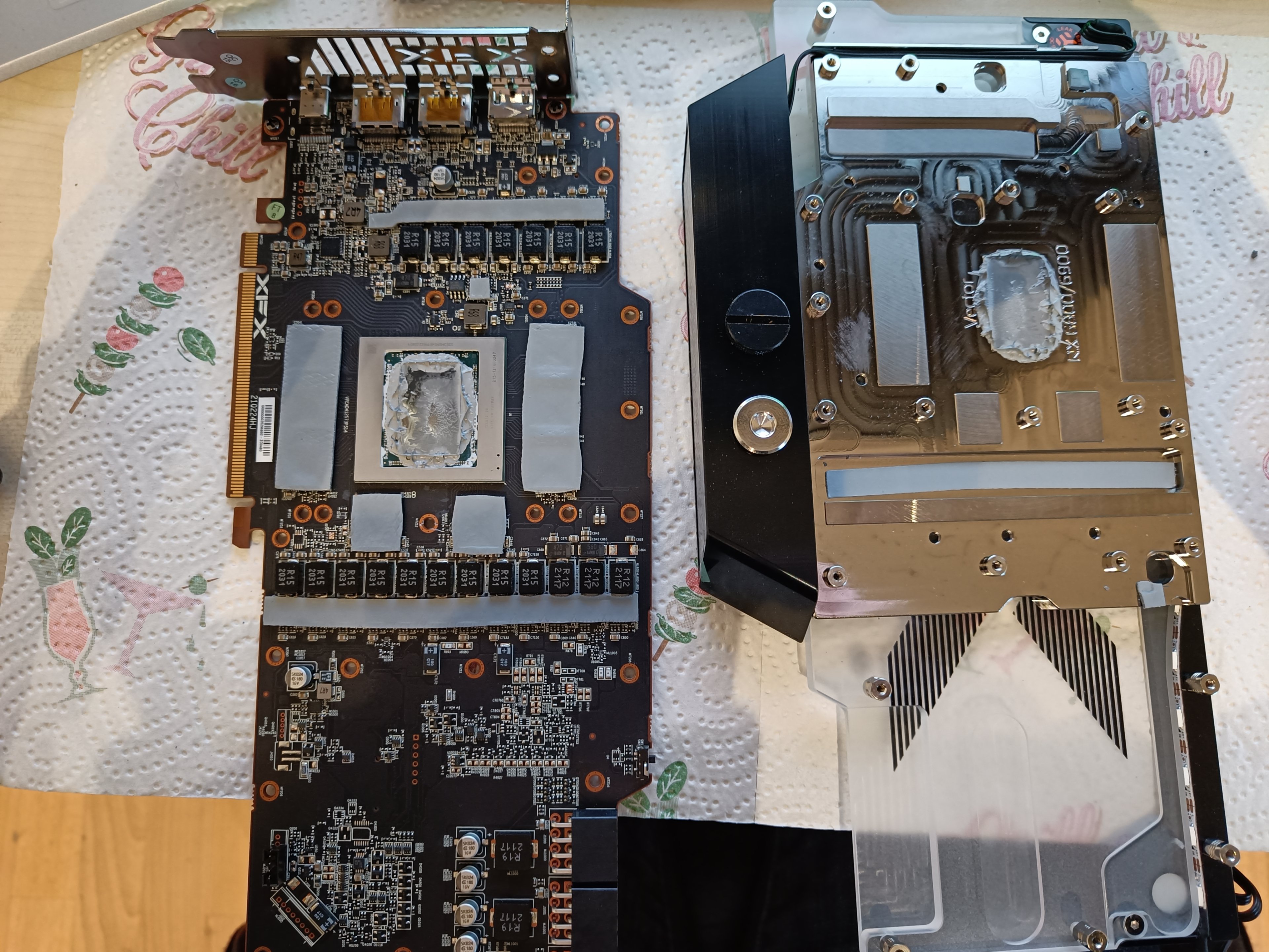 So, hab die Wärmeleitpaste doch schon heute erneuert. Die Pads auf der Vorderseite der Karte, wo die GPU sitzt, kamen bei mir allesamt unbeschädigt runter. Daher habe ich die wiederverwendet und lediglich die Pads von den Spulen entfernt, da tatsächlich keinerlei Kontakt bestanden zu haben scheint.